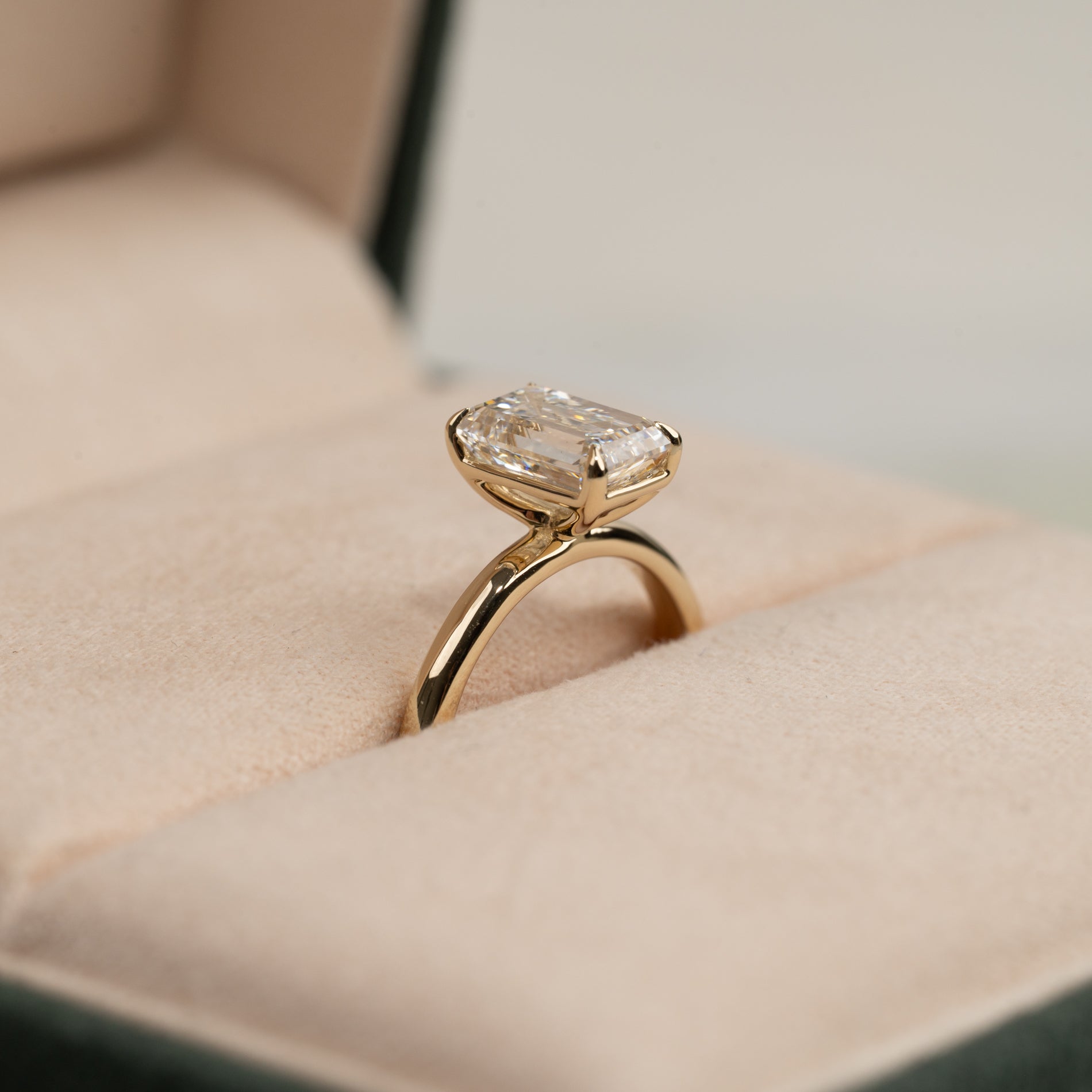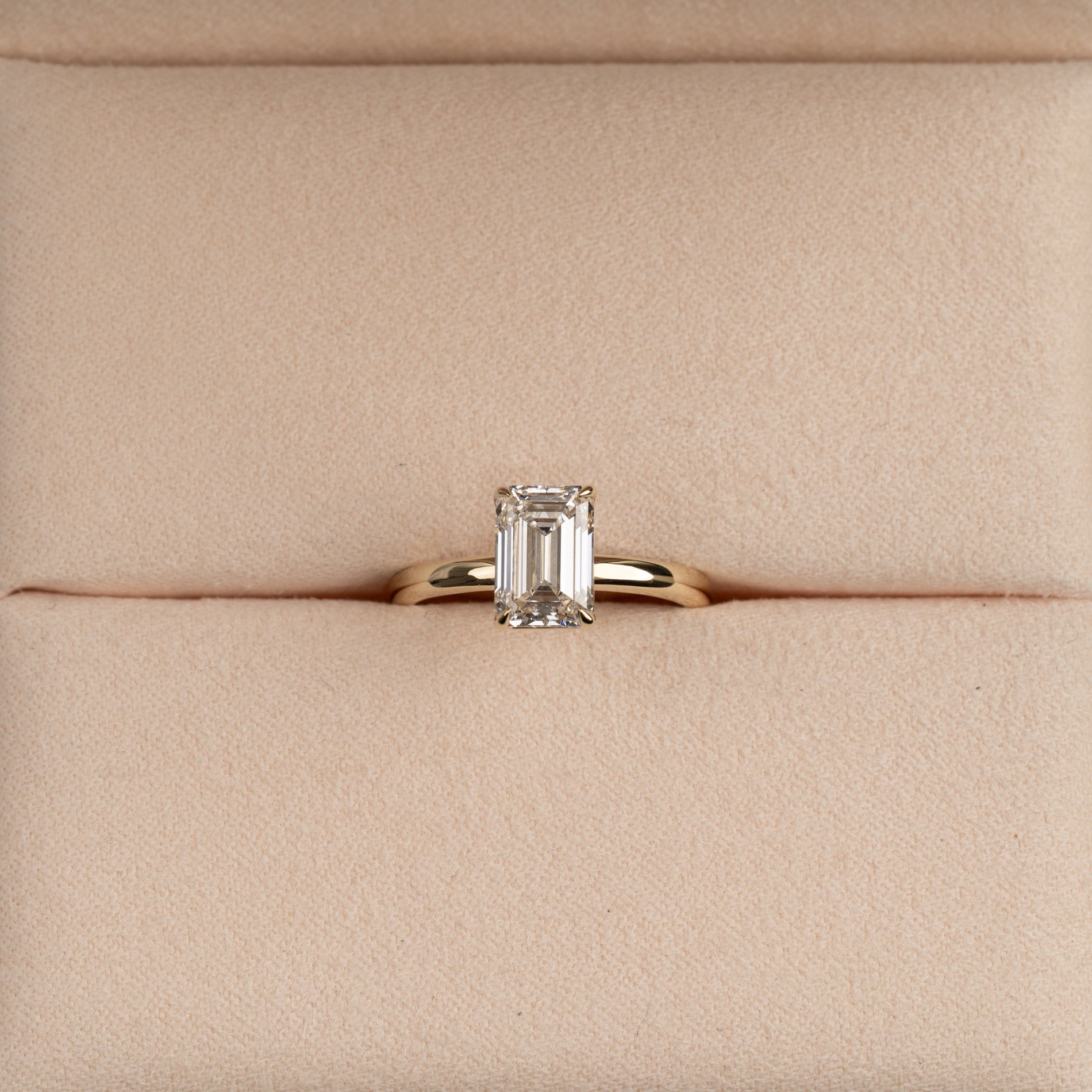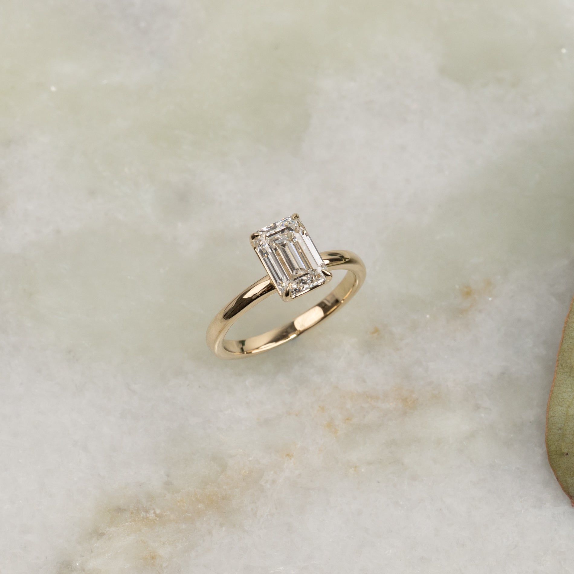 En tidlös ring i 14 karat guld med en vacker smaragdslipad labbodlad diamant på 2.0 ct. Diamanten är elegant infattad i en lätt upphöjd basketinfattning som framhäver lystern och den rektangulära trappstegsfasetten.