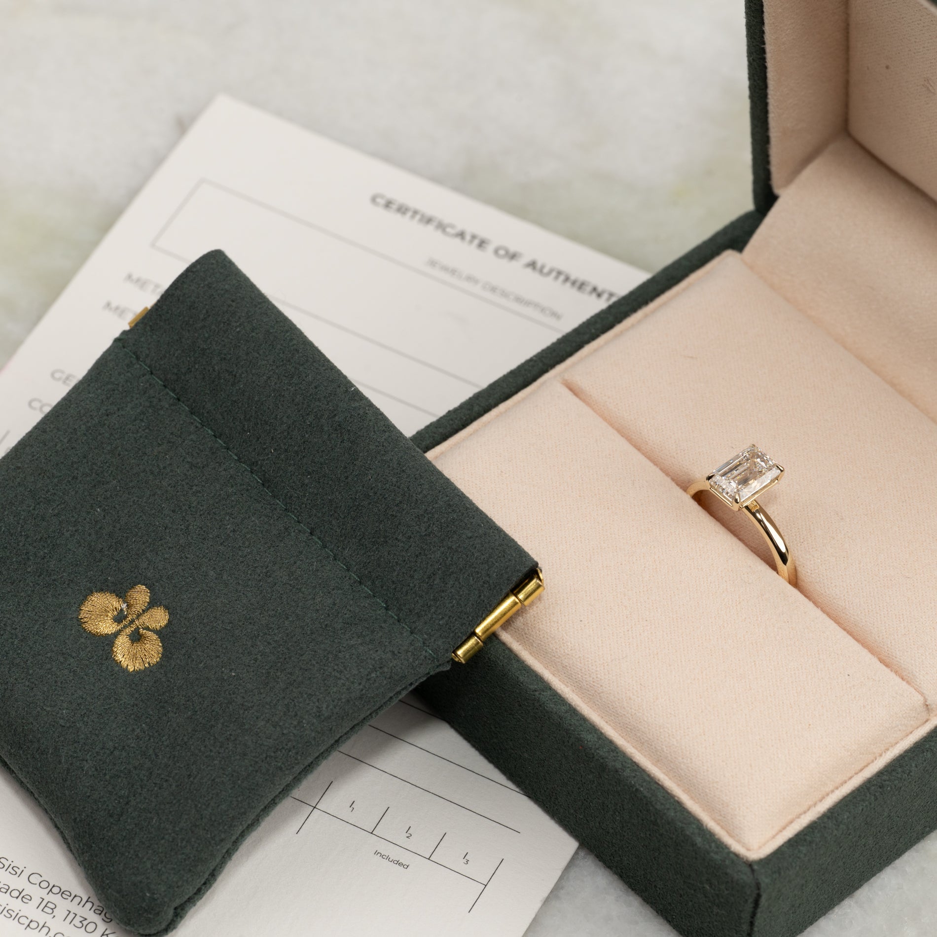 Ringen levereras i vår exklusiva Diamond Collection-box tillsammans med en elegant smyckesask, ett IGI-certifikat och en pouch. Boxen är även perfekt om smycket ska ges bort som gåva.
