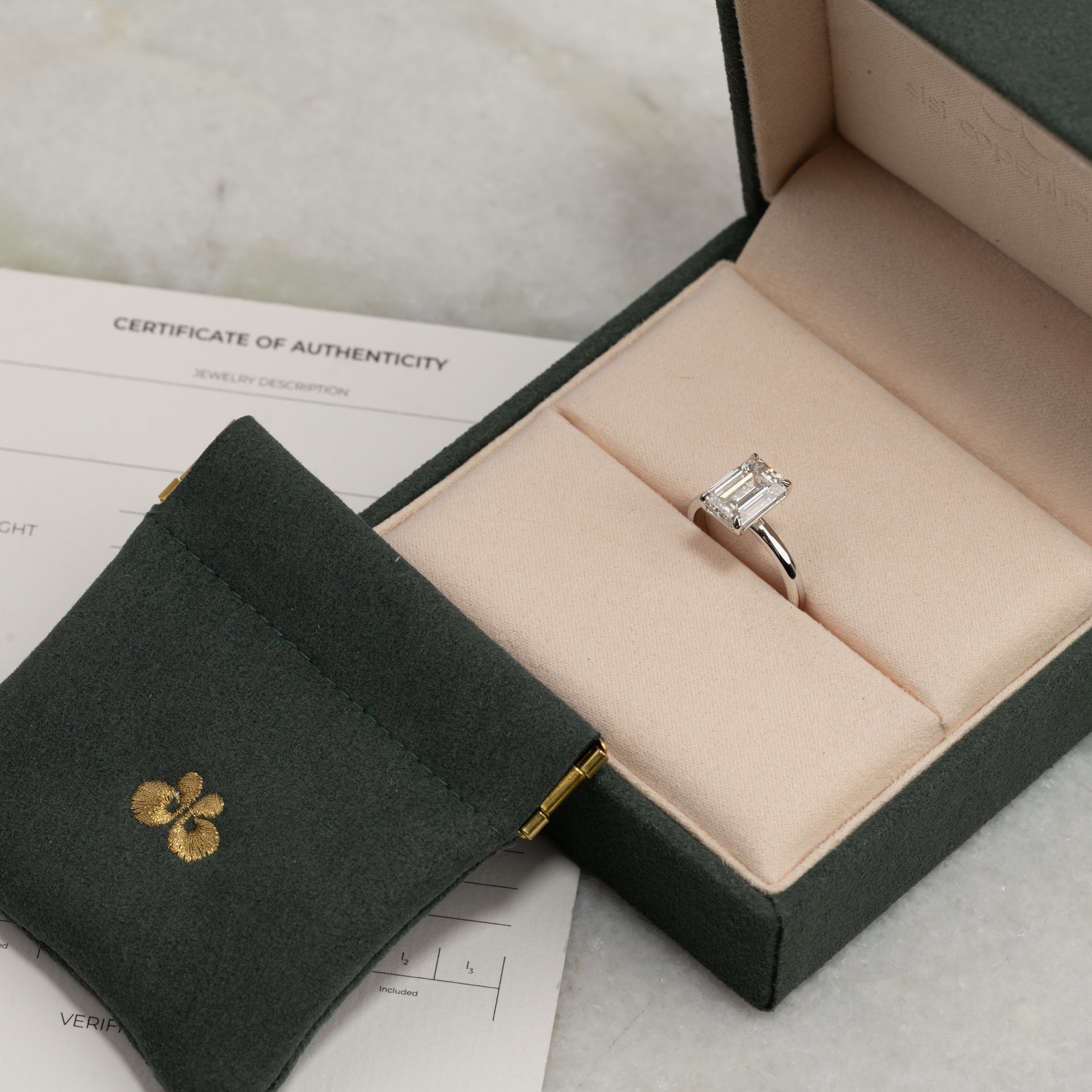 Ringen levereras i vår exklusiva Diamond Collection-box tillsammans med en elegant smyckesask, ett IGI-certifikat och en pouch. Boxen är även perfekt om smycket ska ges bort som gåva.