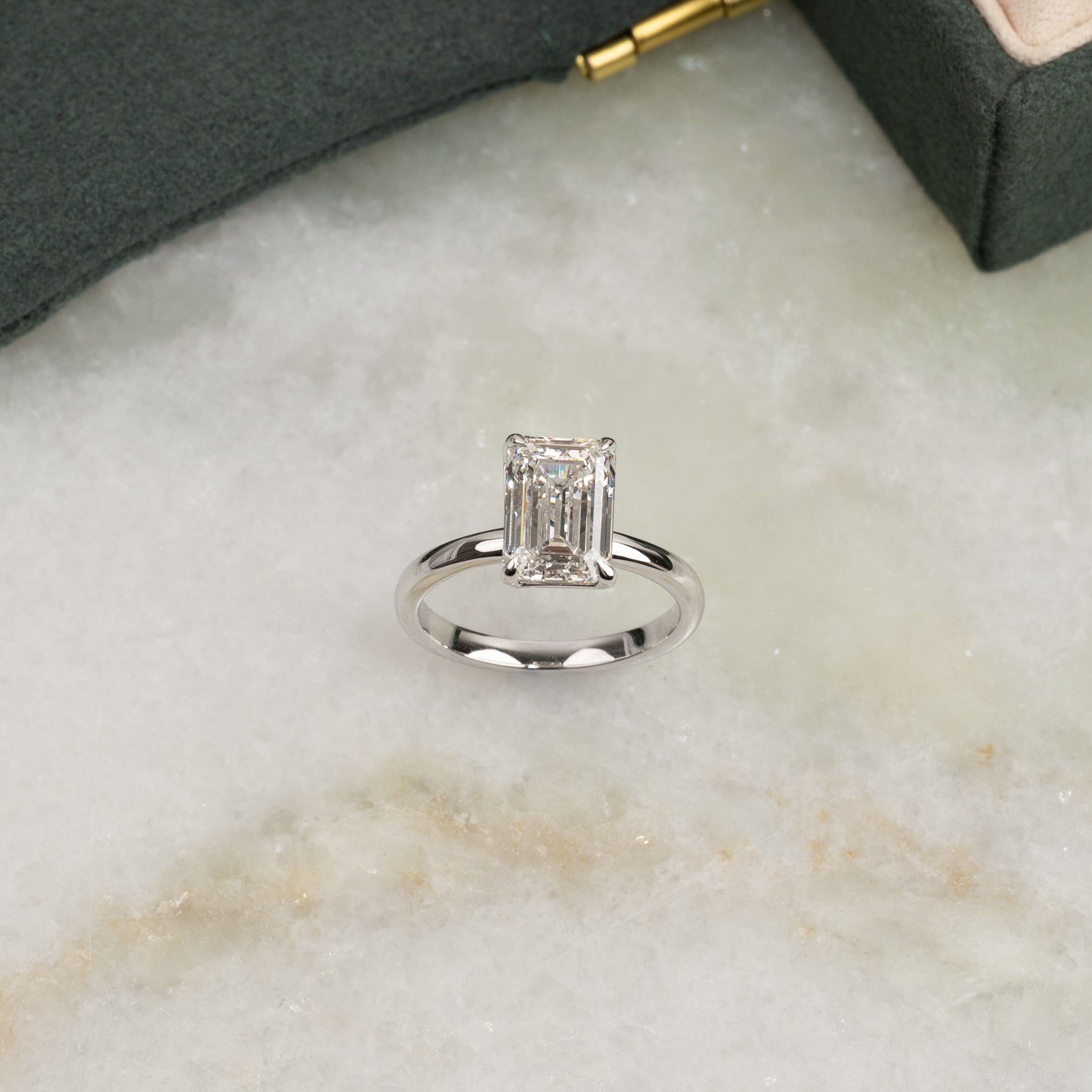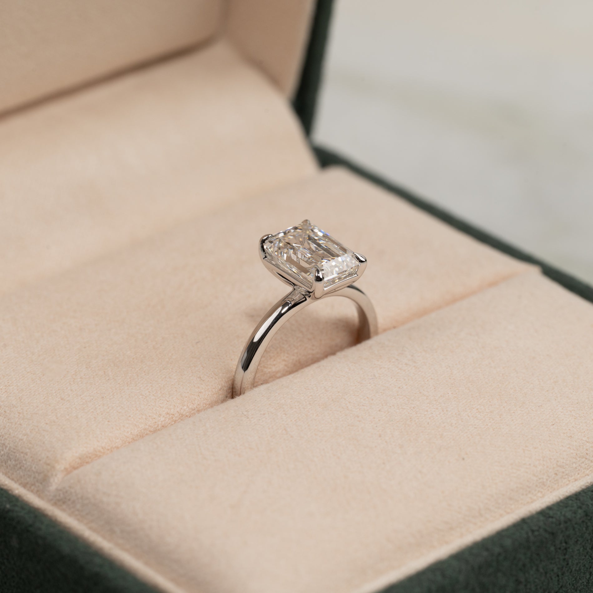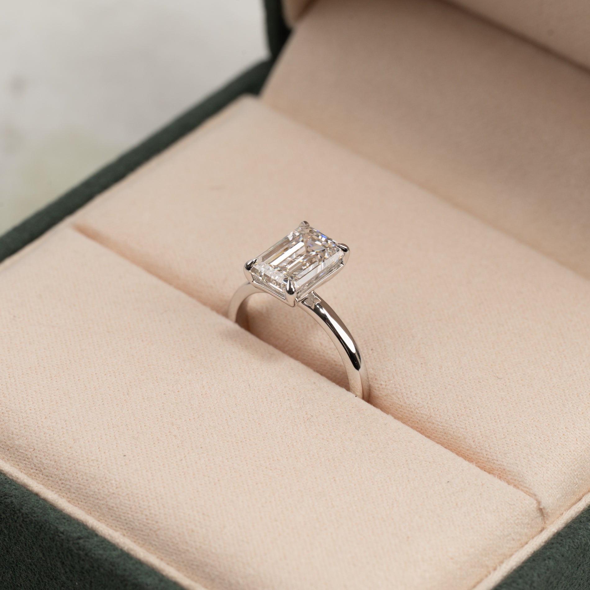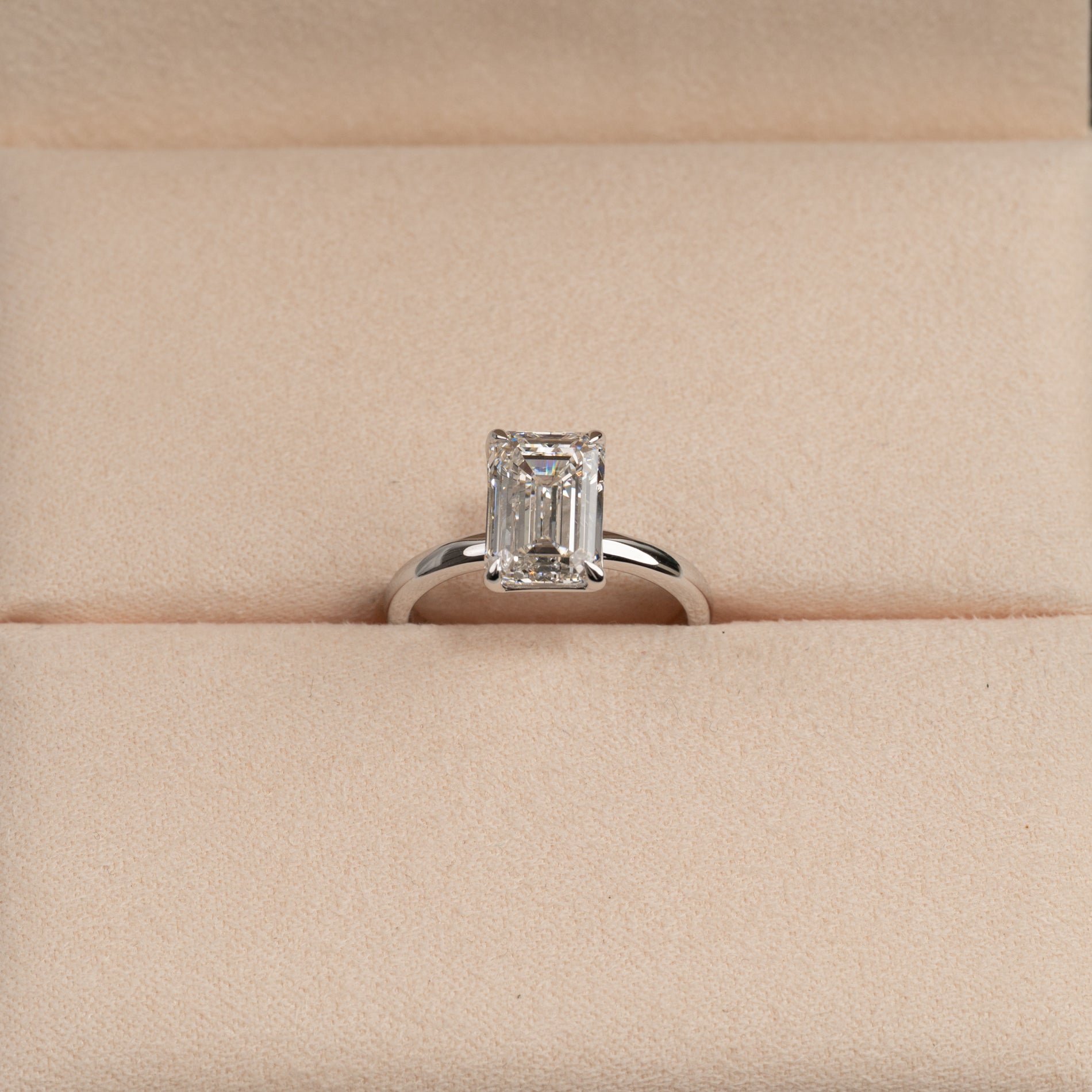 En tidlös ring i 14 karat vitguld med en vacker smaragdslipad labbodlad diamant på 3.0 ct. Diamanten är elegant infattad i en lätt upphöjd basketinfattning som framhäver lystern och den rektangulära trappstegsfasetten.