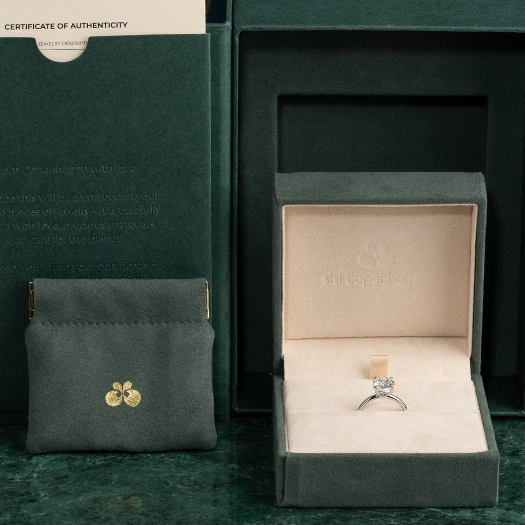 Diamanten har färgen E-F (River / Top Wesselton) och klarheten VVS. Smycket är skapat med omtanke; diamanterna är producerade med bland annat solenergi, och guldet är 100% certifierat återvunnet.