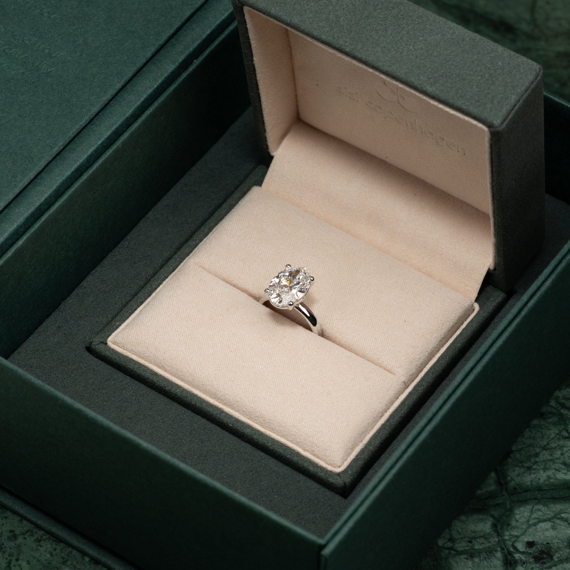 Ringen är tillverkad i 14 karat massivt vitguld med en labbodlad diamant på 5,0 ct. i färgen E-F (River) och klarheten VVS. Diamanten är framställd med bland annat solenergi, och guldet är 100% certifierat återvunnet.