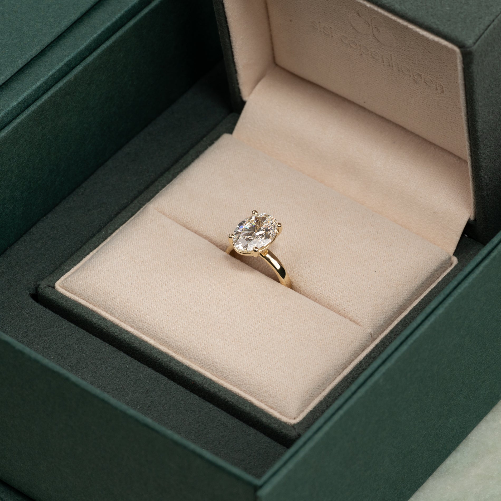 Ringen är tillverkad i 14 karat massivt guld med en labbodlad diamant på 5,0 ct. i färgen E-F (River) och klarheten VVS. Diamanten är framställd med bland annat solenergi, och guldet är 100% certifierat återvunnet.