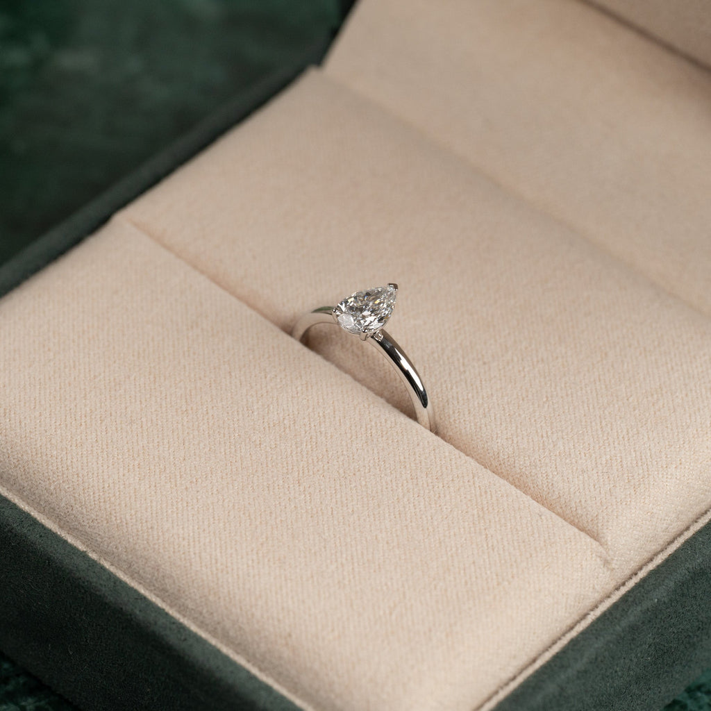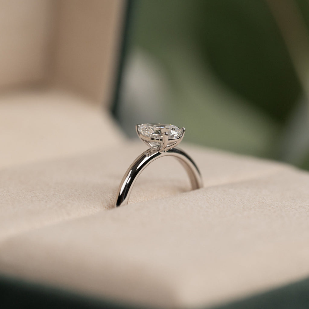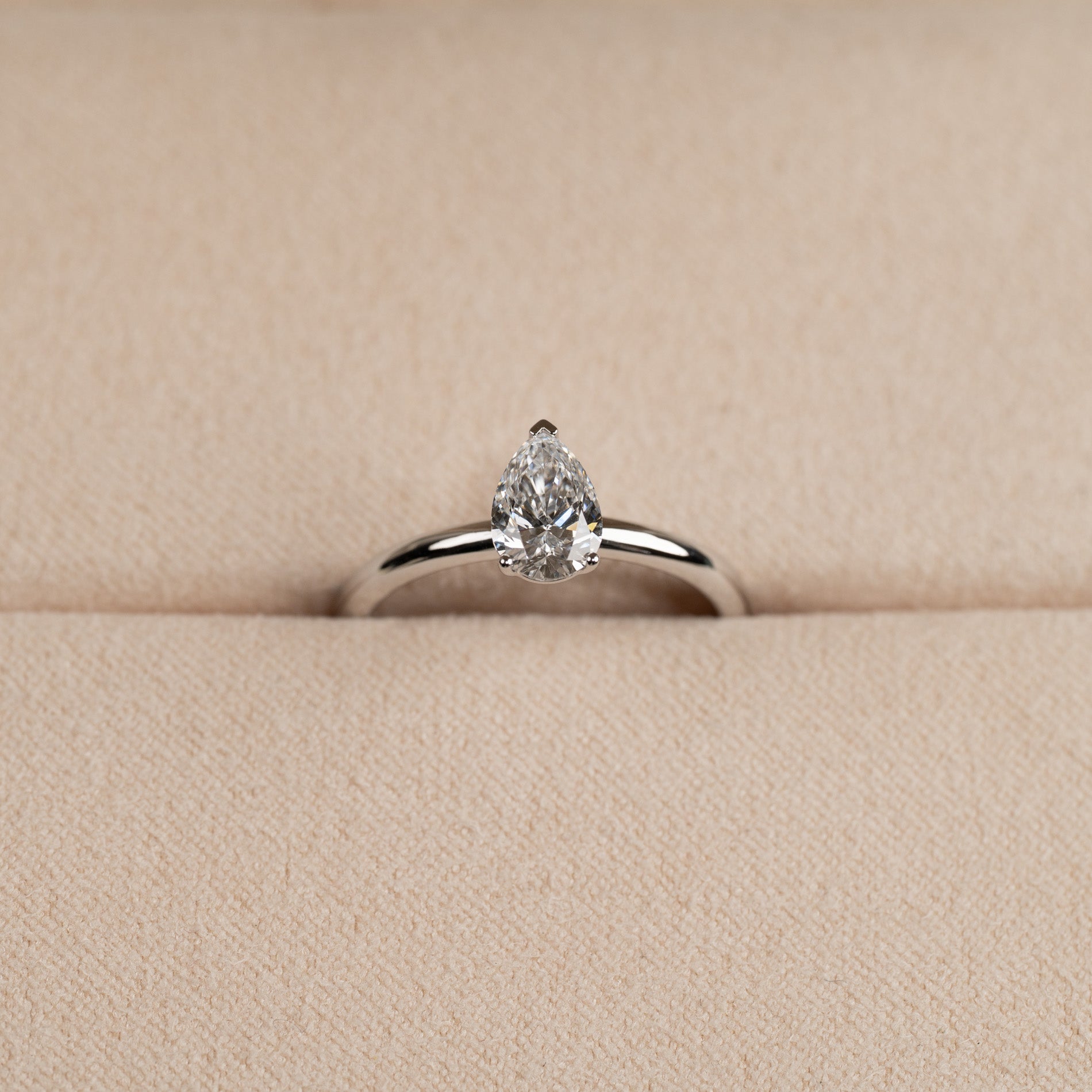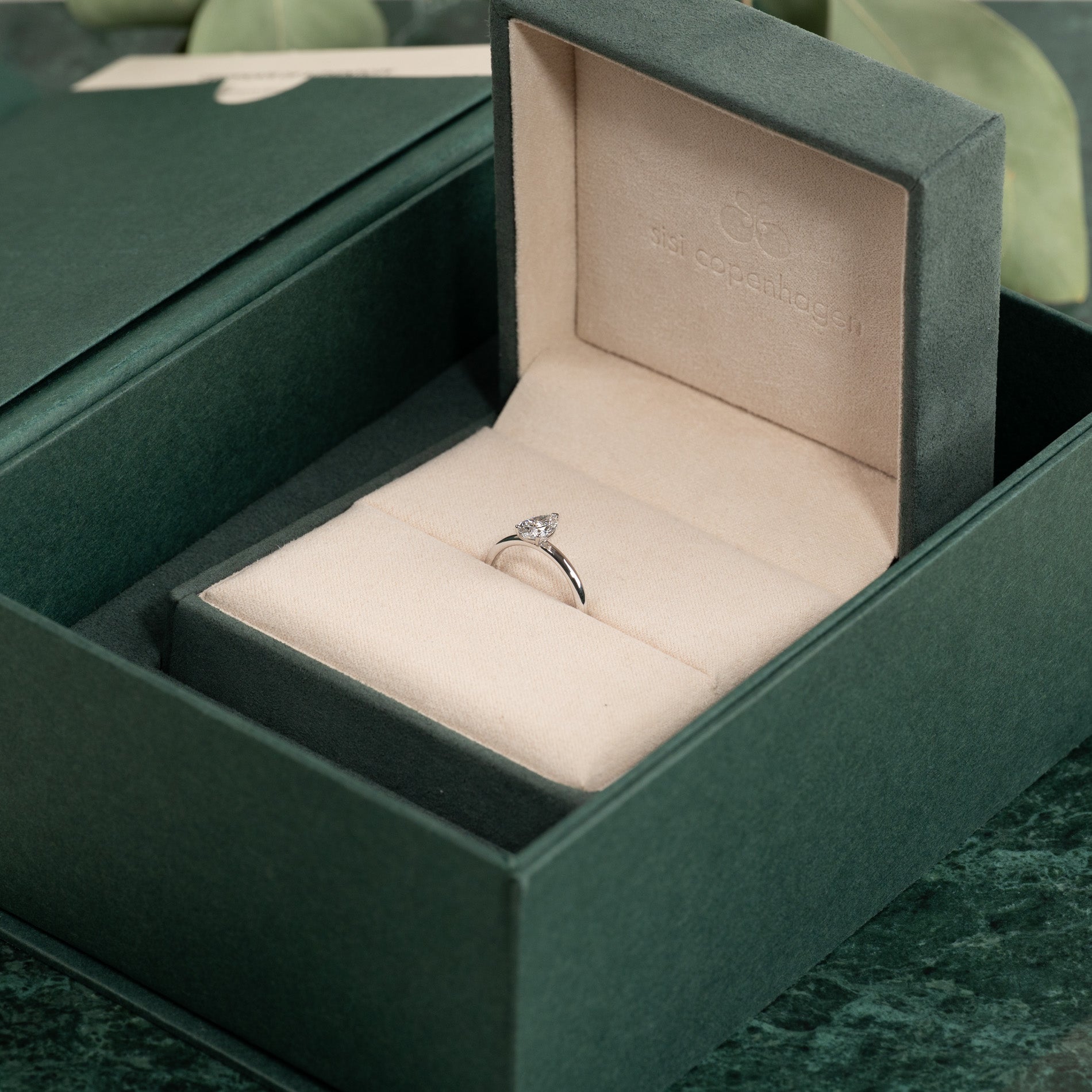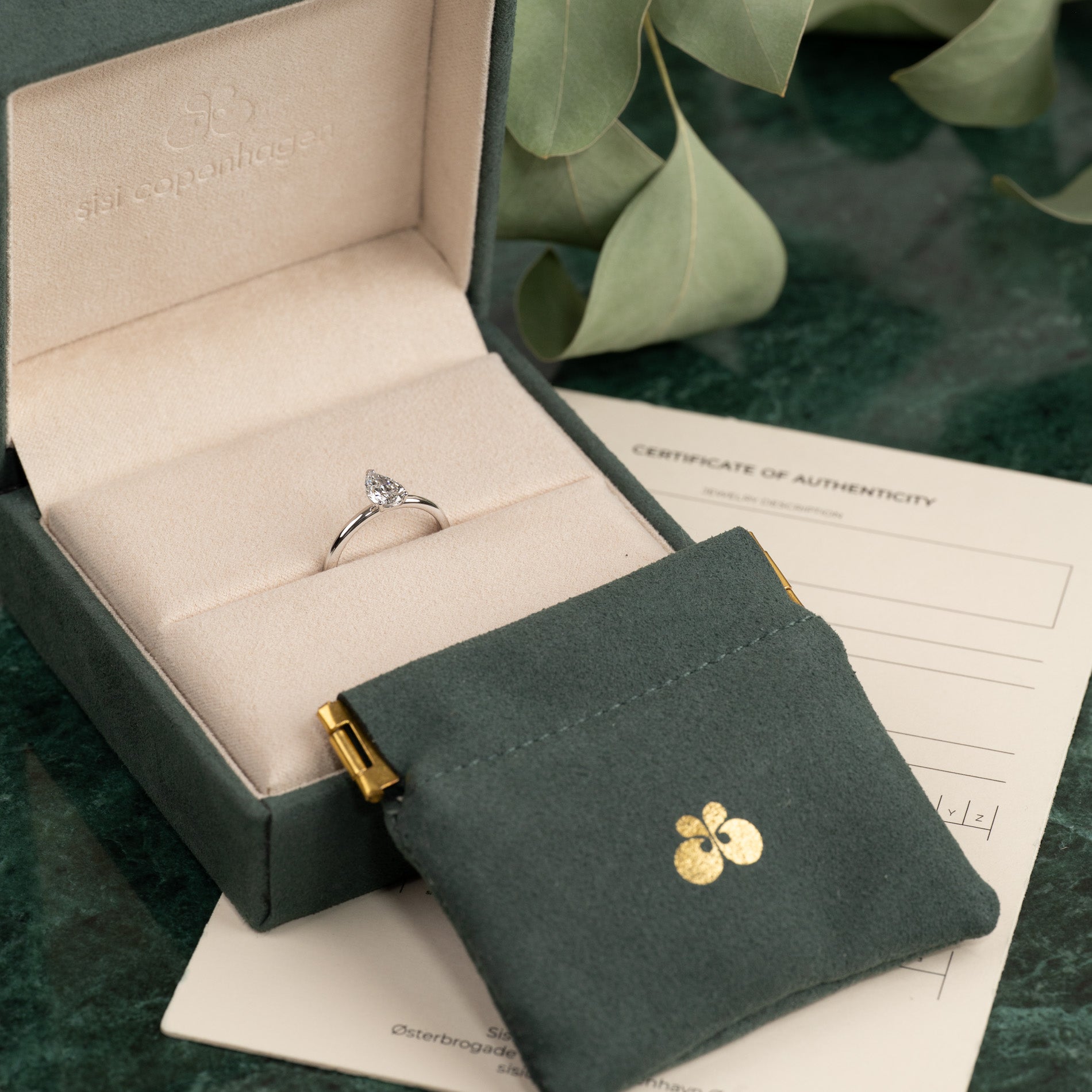 Ringen är tillverkad i 14 karat massivt vitguld och pryds av en etiskt skapad labbodlad diamant på 0,75 ct. (7,5 x 4,9 mm) i färgen E/F (River) och med klarheten VVS. Smycket är skapat med omtanke om miljön. Diamanterna är tillverkade med hjälp av bland annat solenergi, och guldet är 100 % certifierat återvunnet.