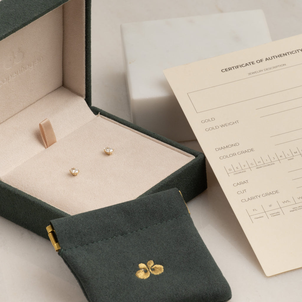 Örhängena är tillverkade i 14 kt. massivt guld med labbodlade diamanter på totalt 0,5 ct. (2 x 0,25 ct.). Diamanterna har färgen E/F (River) och klarhet VVS. Guldet är dessutom 100% certifierat återvunnet.