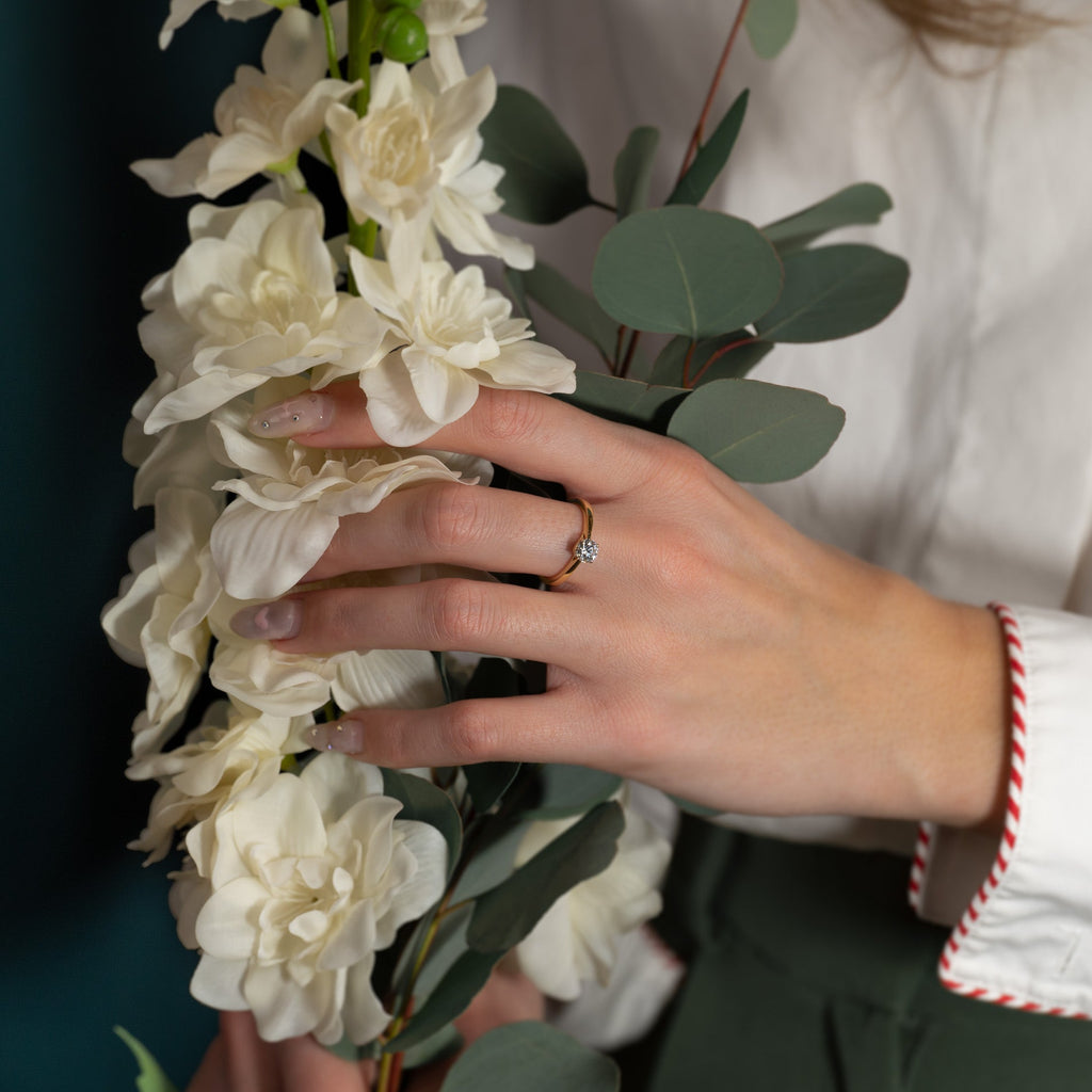 Ringen är tillverkad av 14 kt. massivt guld med en labbodlad diamant på 0,55 ct. Diamanten är briljantslipad (rund), har färgen E/F (River) och klarheten VVS. Ringen har en guldvikt på 2,4 g och guldet är 100% certifierat återvunnet.