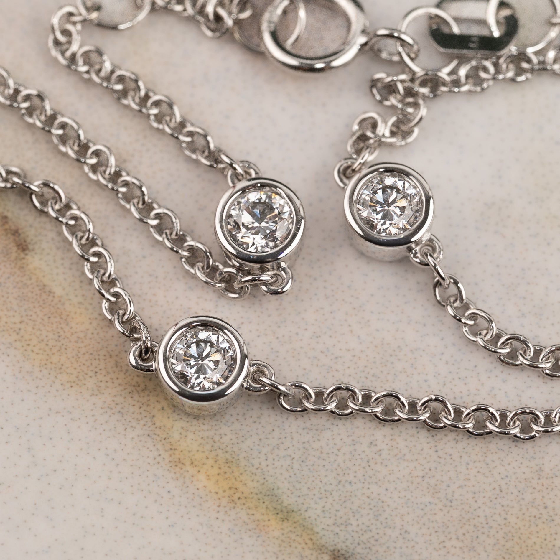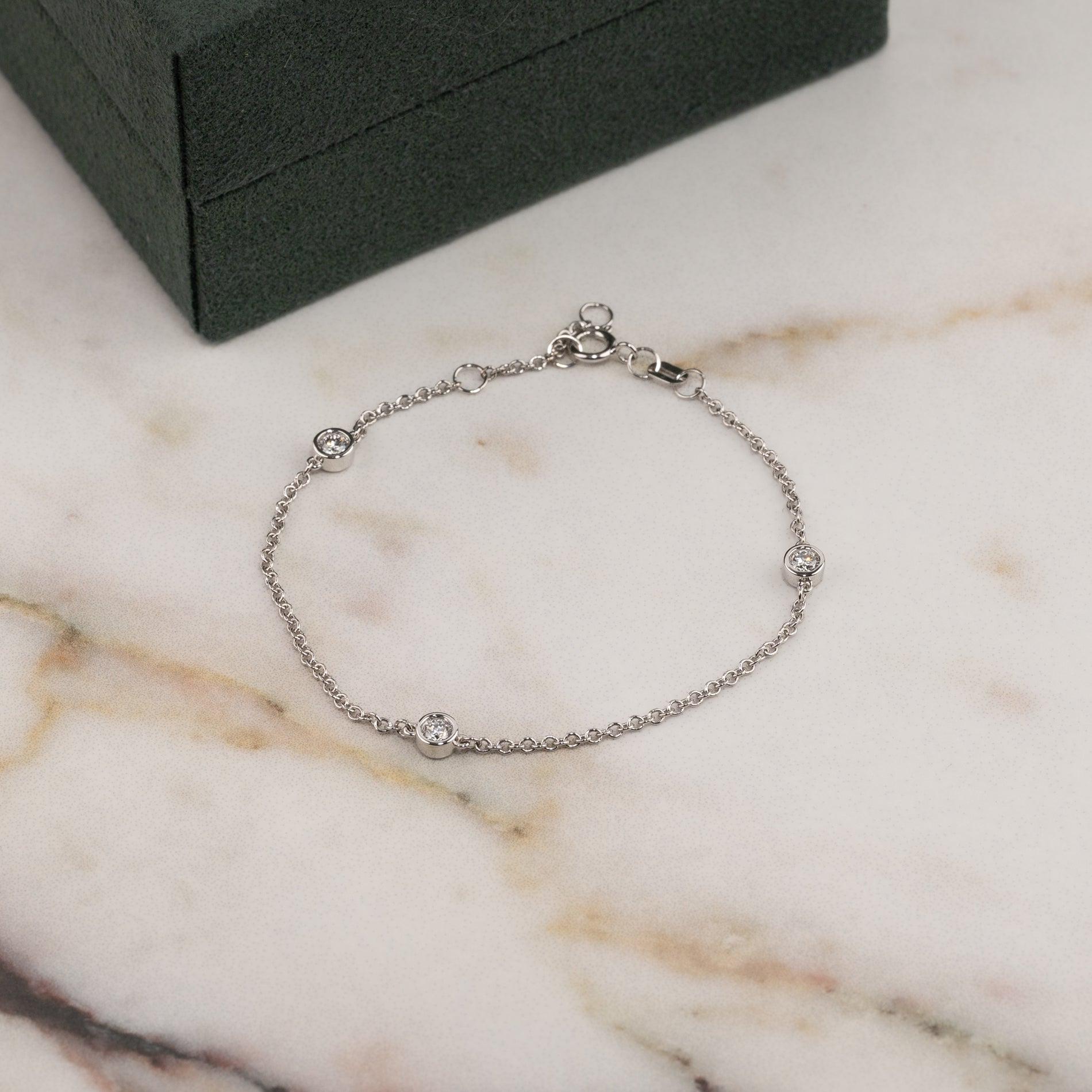 Ett klassiskt och tidlöst armband i 14 kt. vitguld med tre labbodlade diamanter, vackert infattade i eleganta bezel-infattningar.