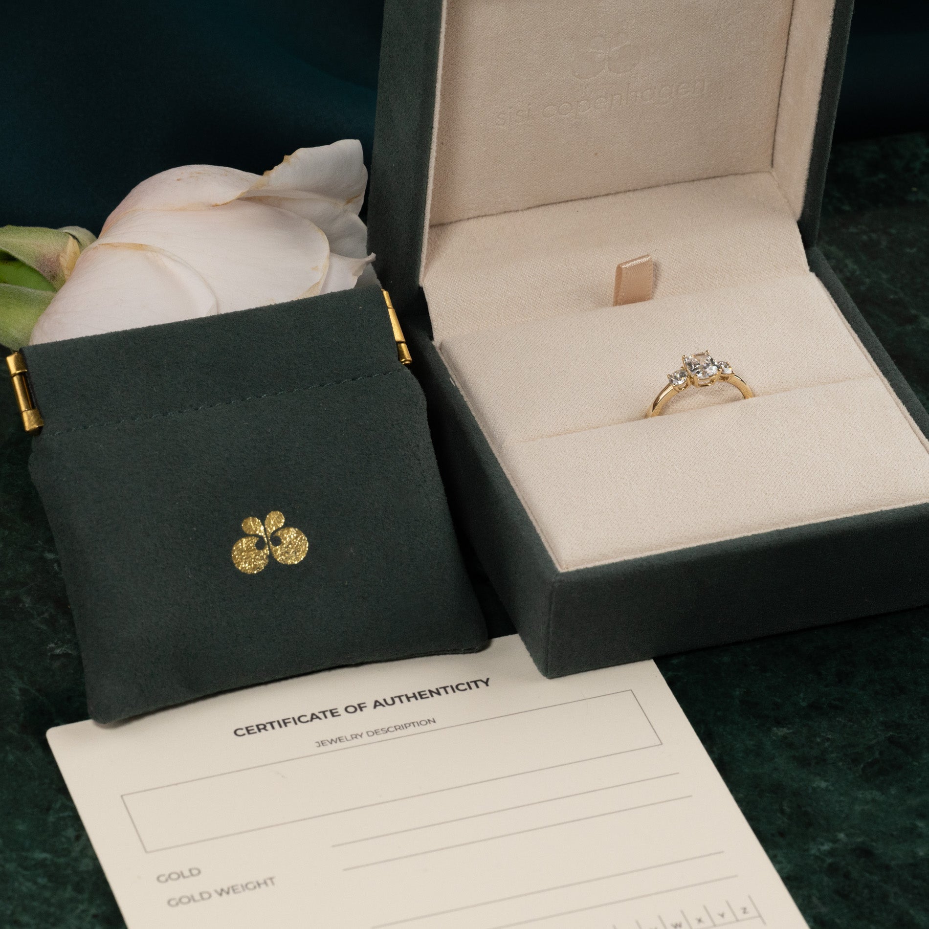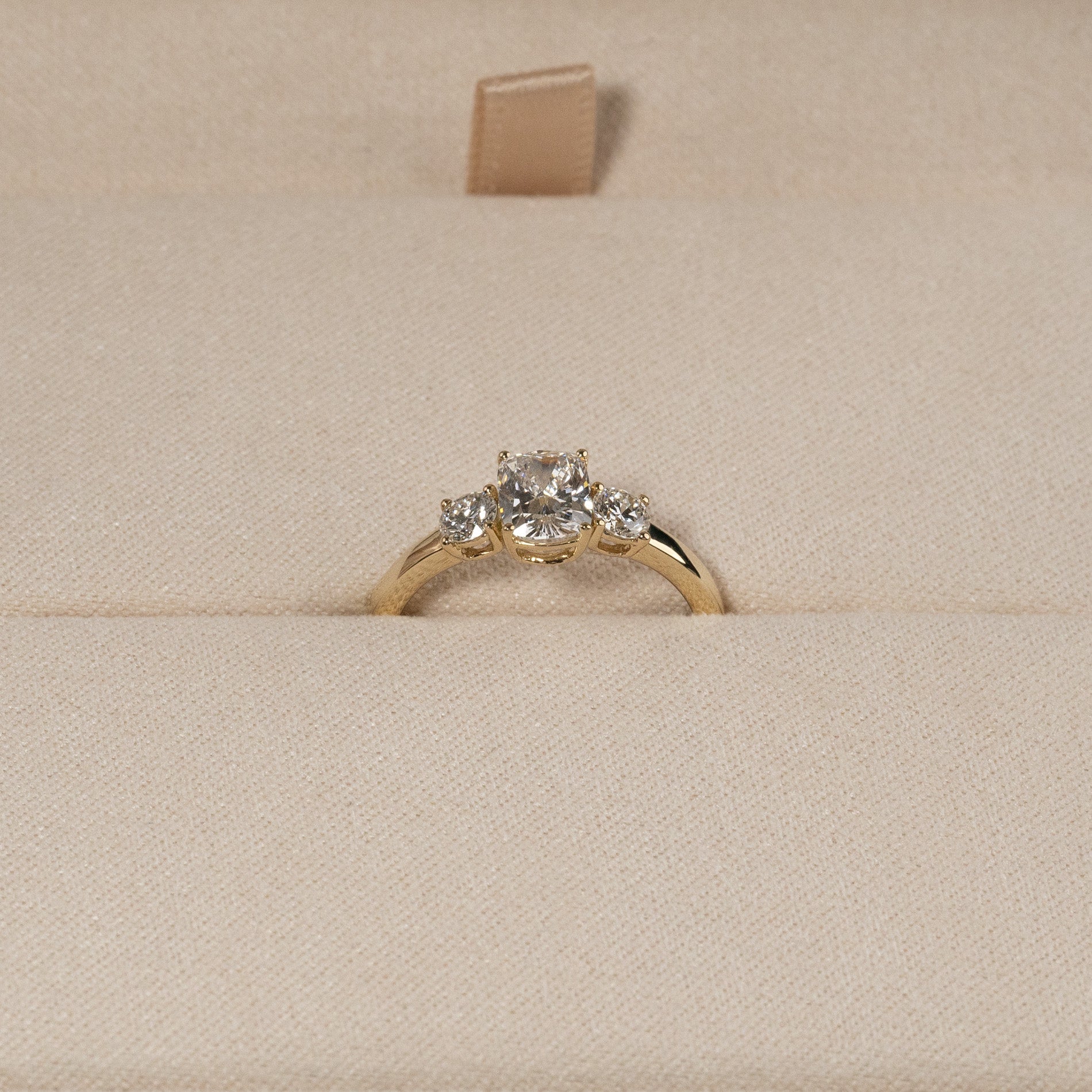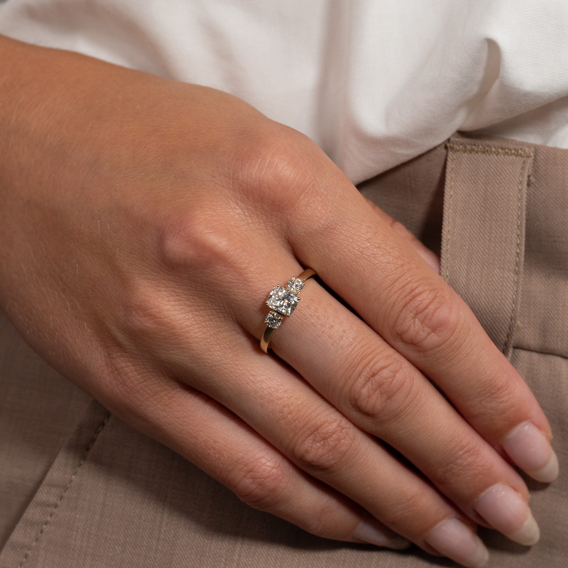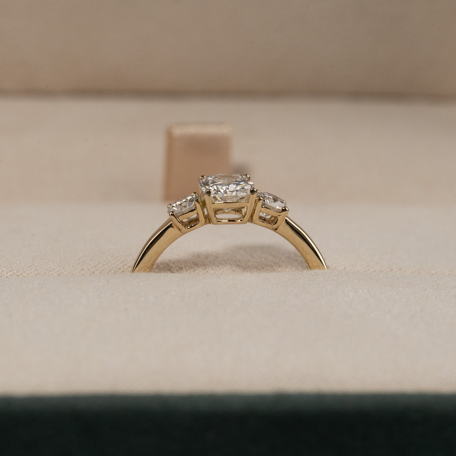 Ring i 14 kt. massivt guld med tre labbodlade diamanter. Centerstenen är en avlång cushion-cut labbodlad diamant på 0,8 ct. De två mindre diamanterna har en sammanlagd vikt på 0,35 ct. Totalt har ringen en caratvikt på 1,15 ct. Infattningen är designad som en alliansinfattning. Ringen är ett klassiskt och tidlöst smycke som dessutom kan användas som förlovningsring.
