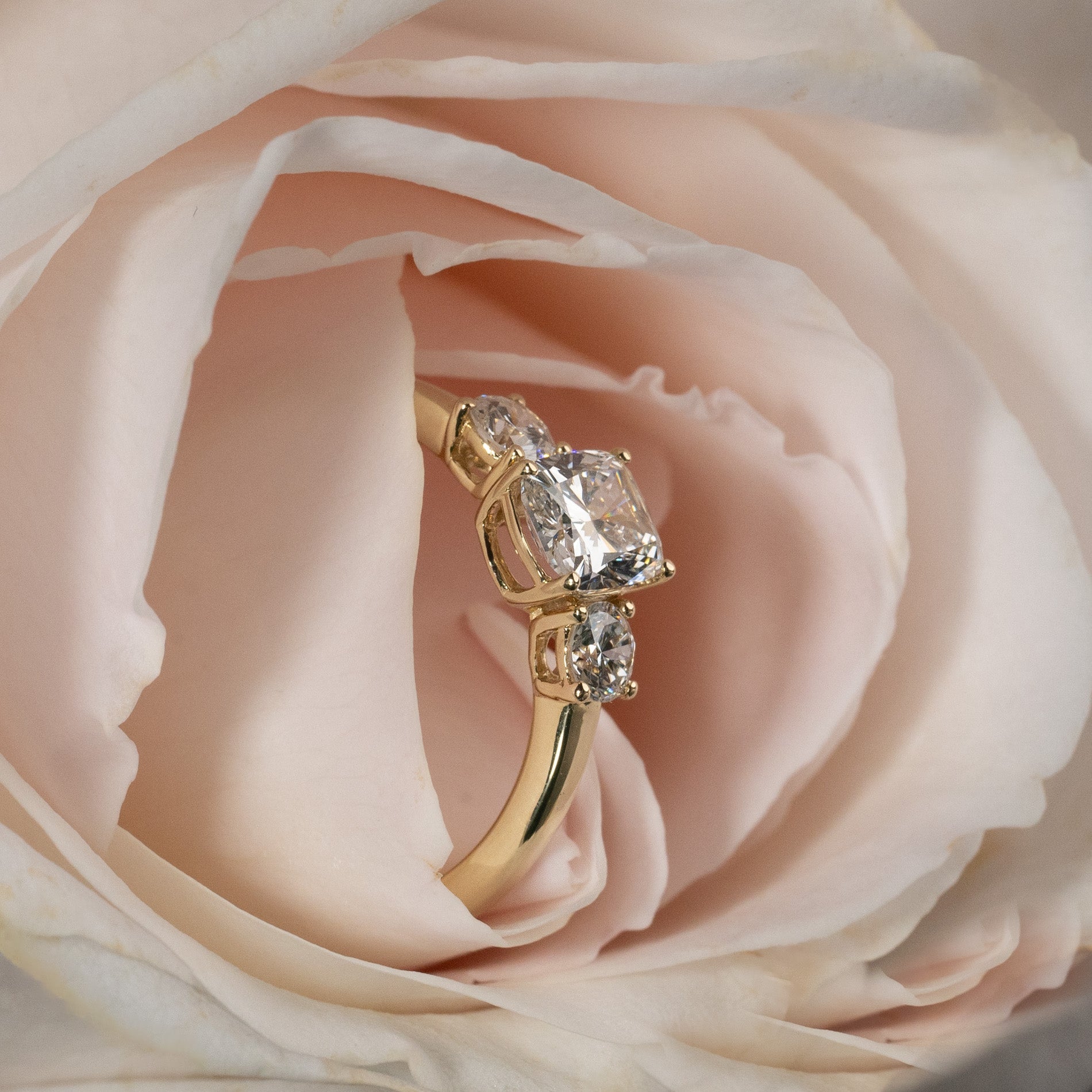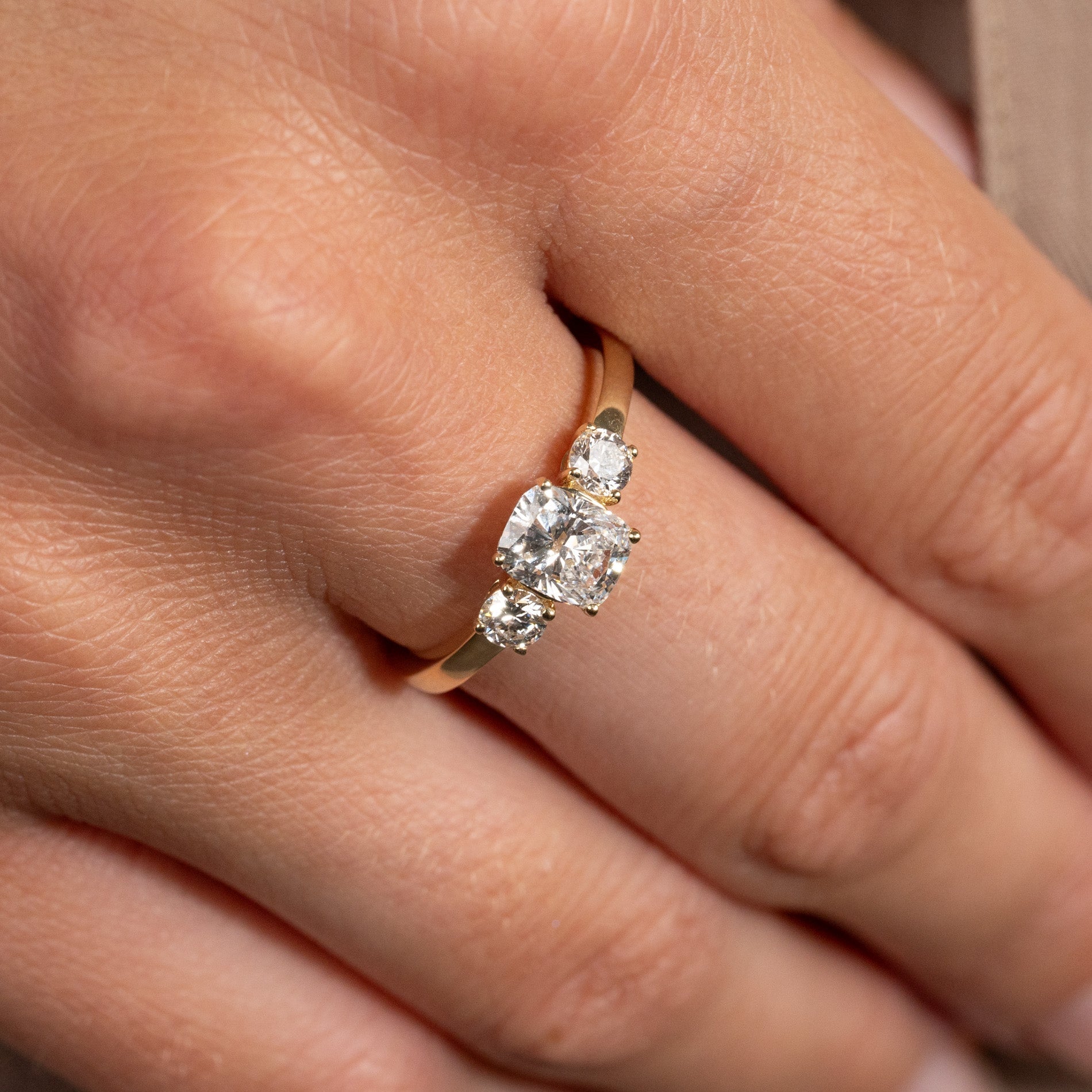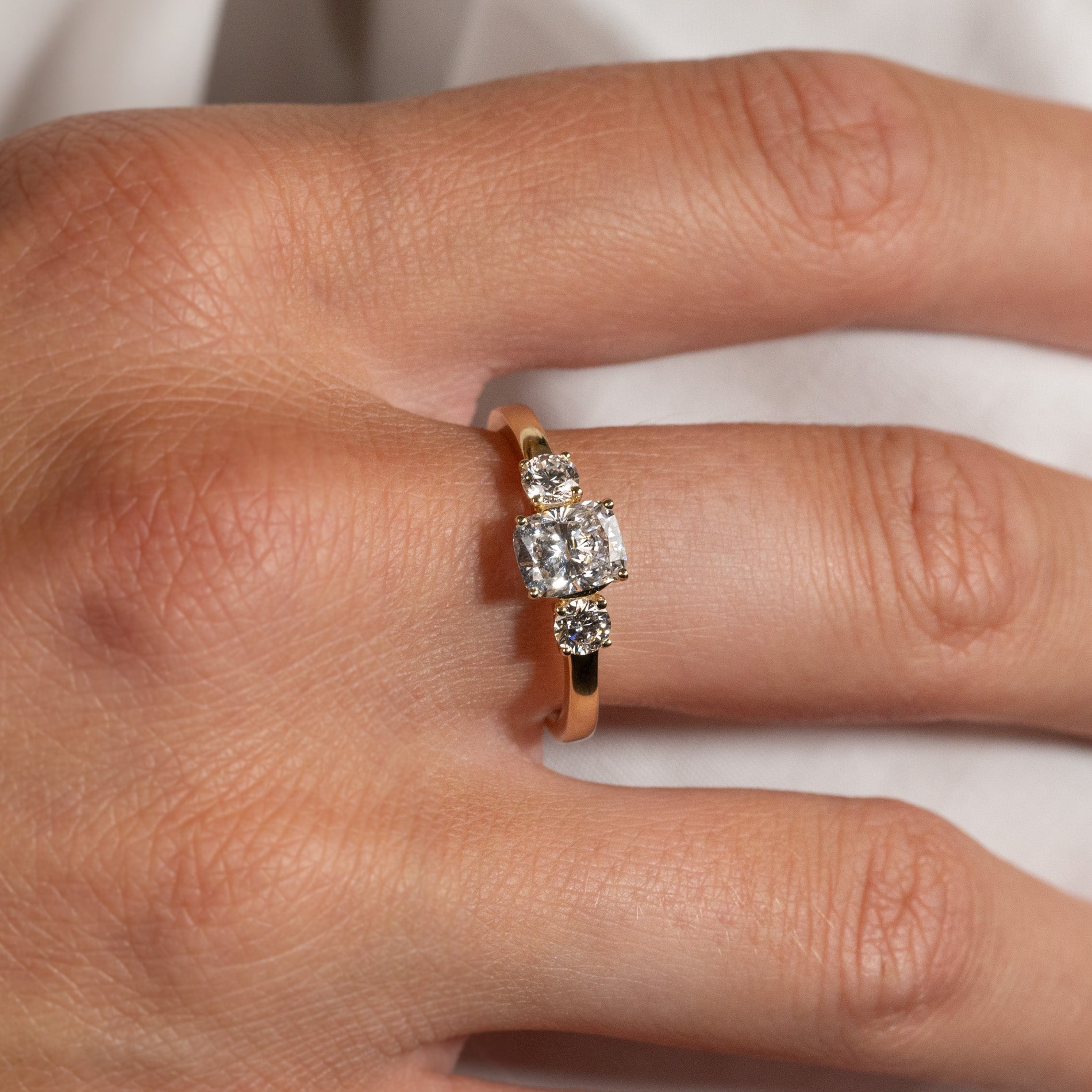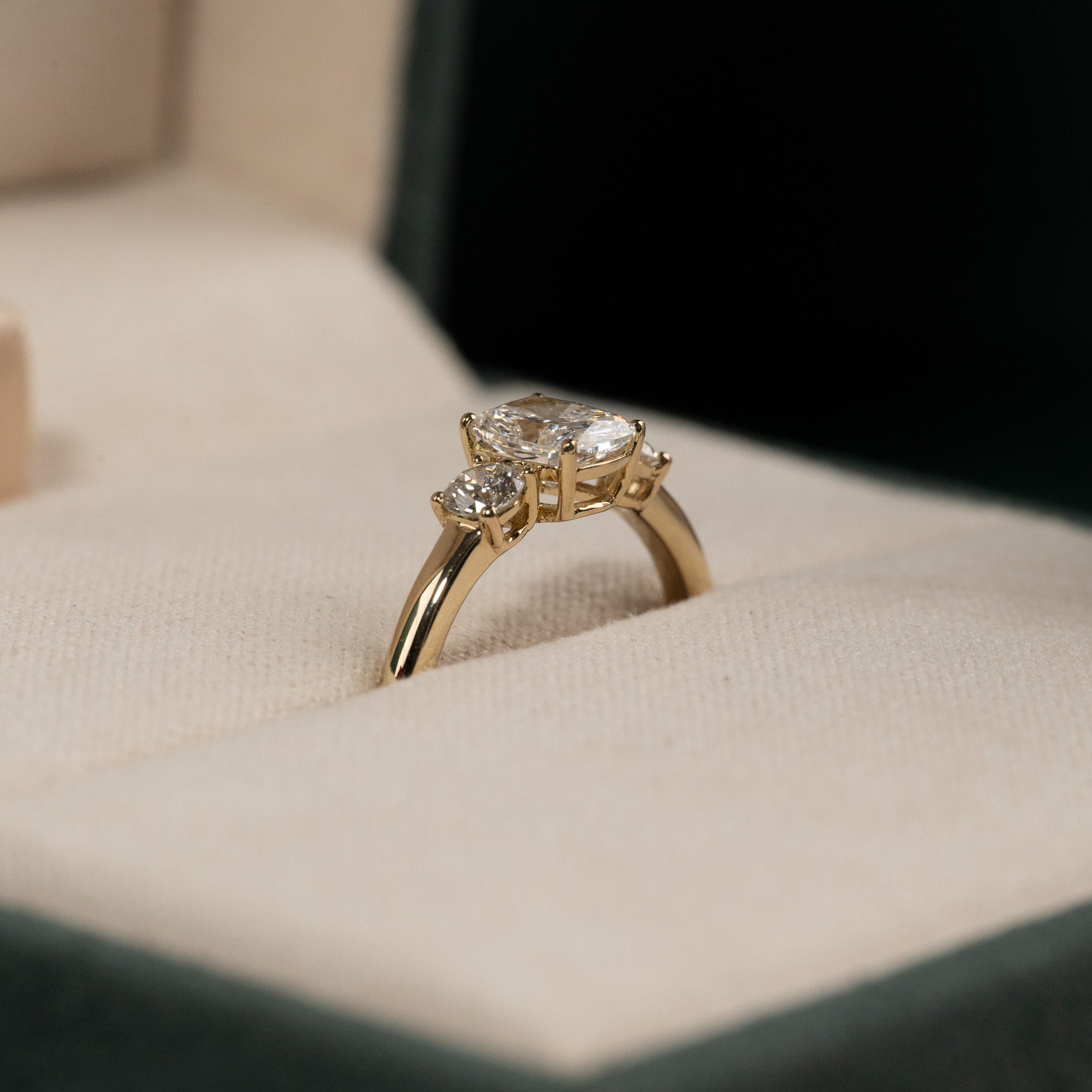 Ring i 14 kt. massivt guld med tre labbodlade diamanter. Centerstenen är en avlång cushion-cut labbodlad diamant på 0,8 ct. De två mindre diamanterna har en sammanlagd vikt på 0,35 ct. Totalt har ringen en caratvikt på 1,15 ct. Infattningen är designad som en alliansinfattning. Ringen är ett klassiskt och tidlöst smycke som dessutom kan användas som förlovningsring.