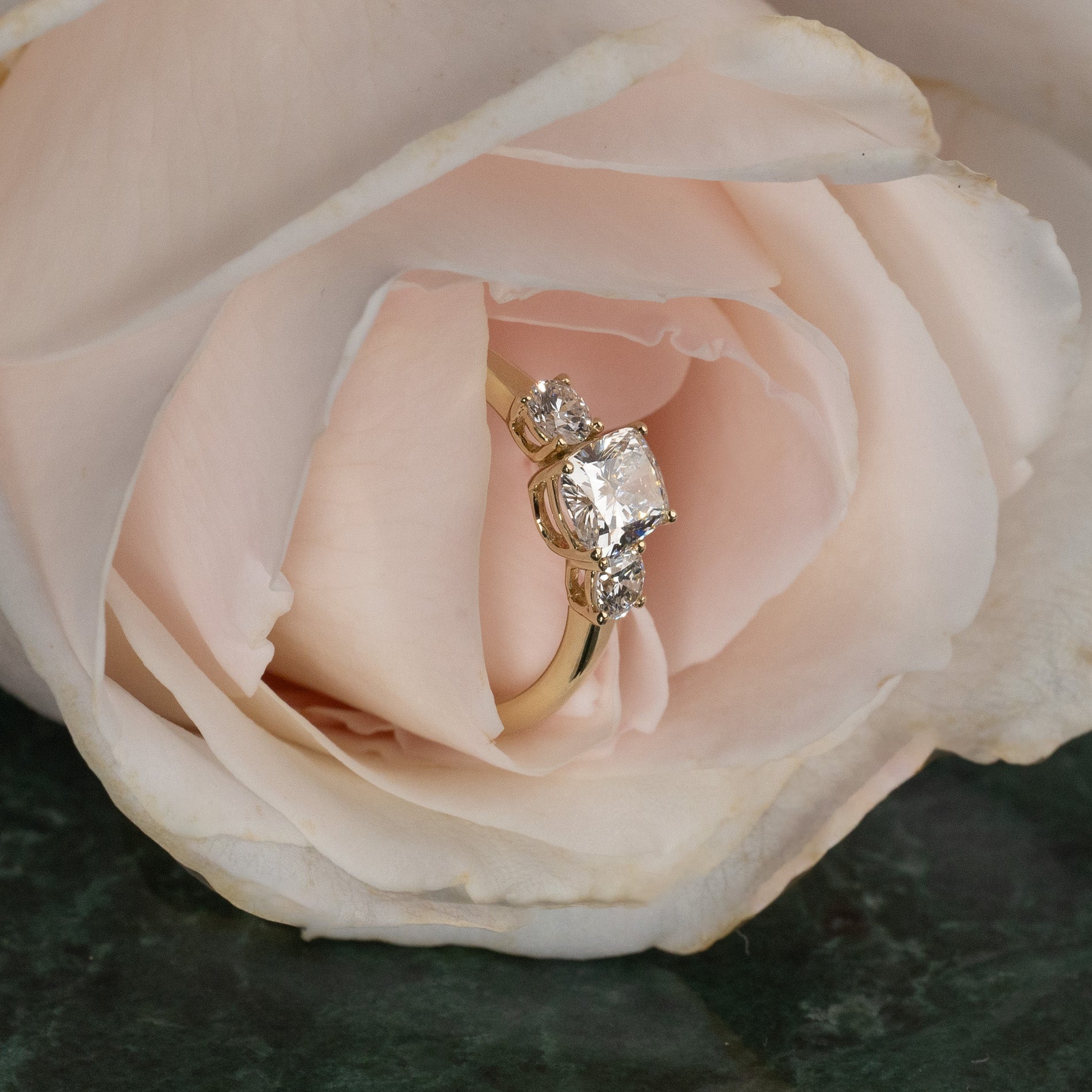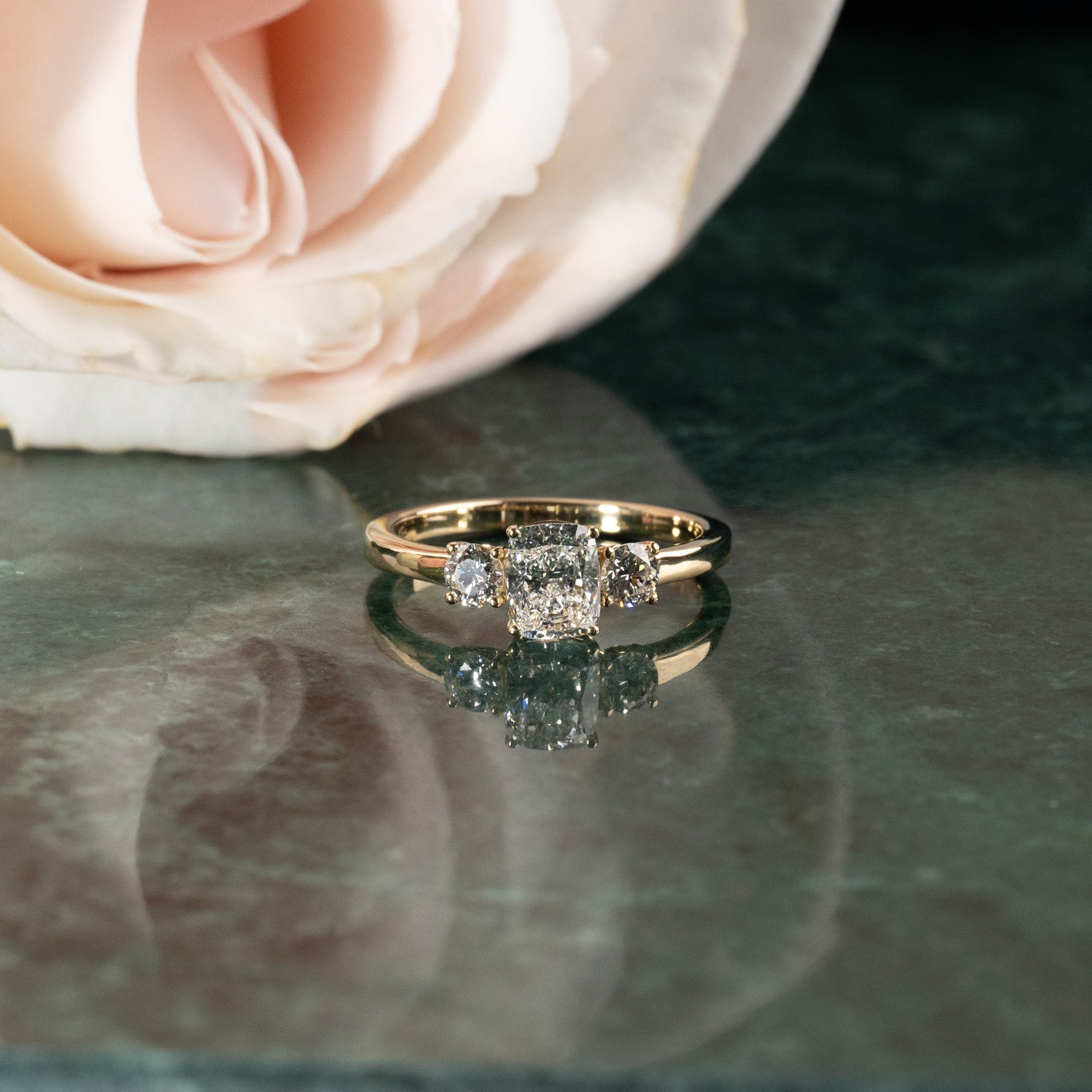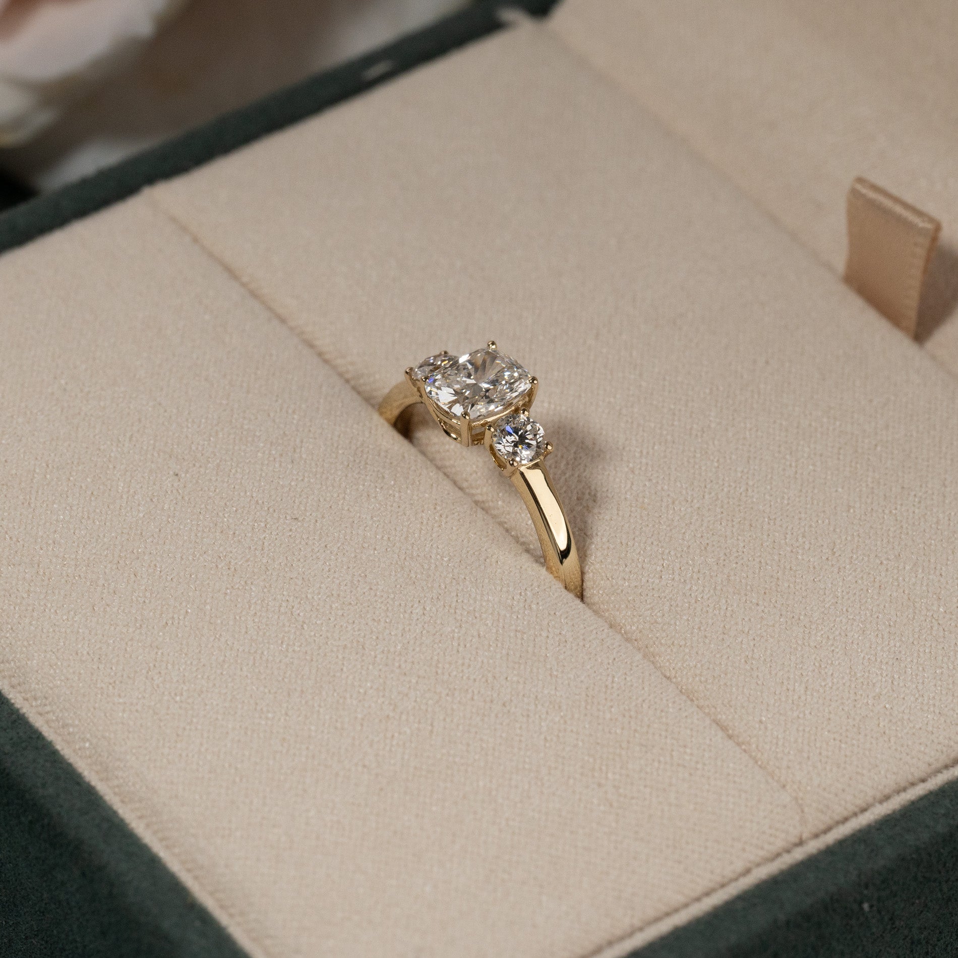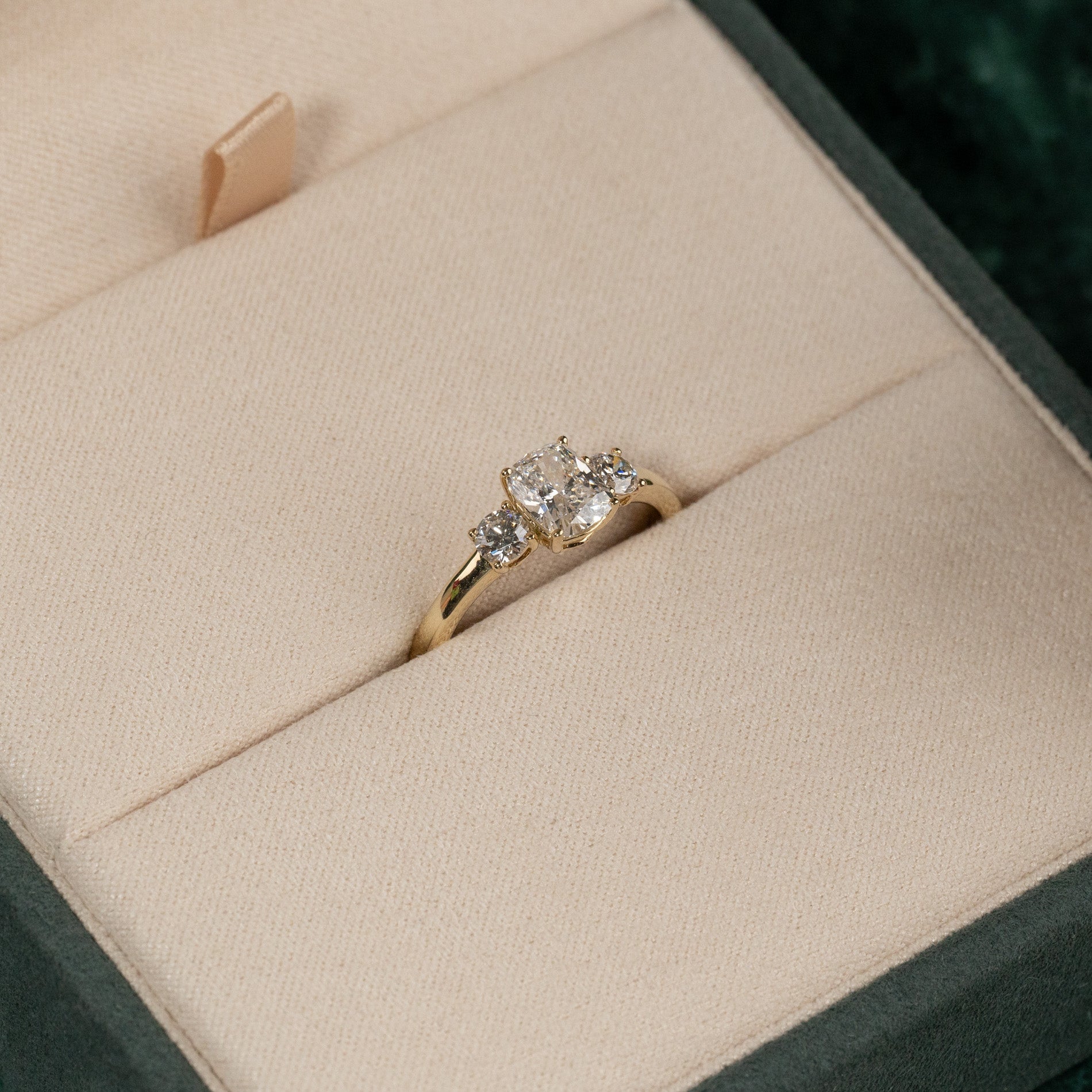 3-stens 1,15 ct. diamantring (lab.) med avlång "cushion-cut" centersten i 14kt. guld