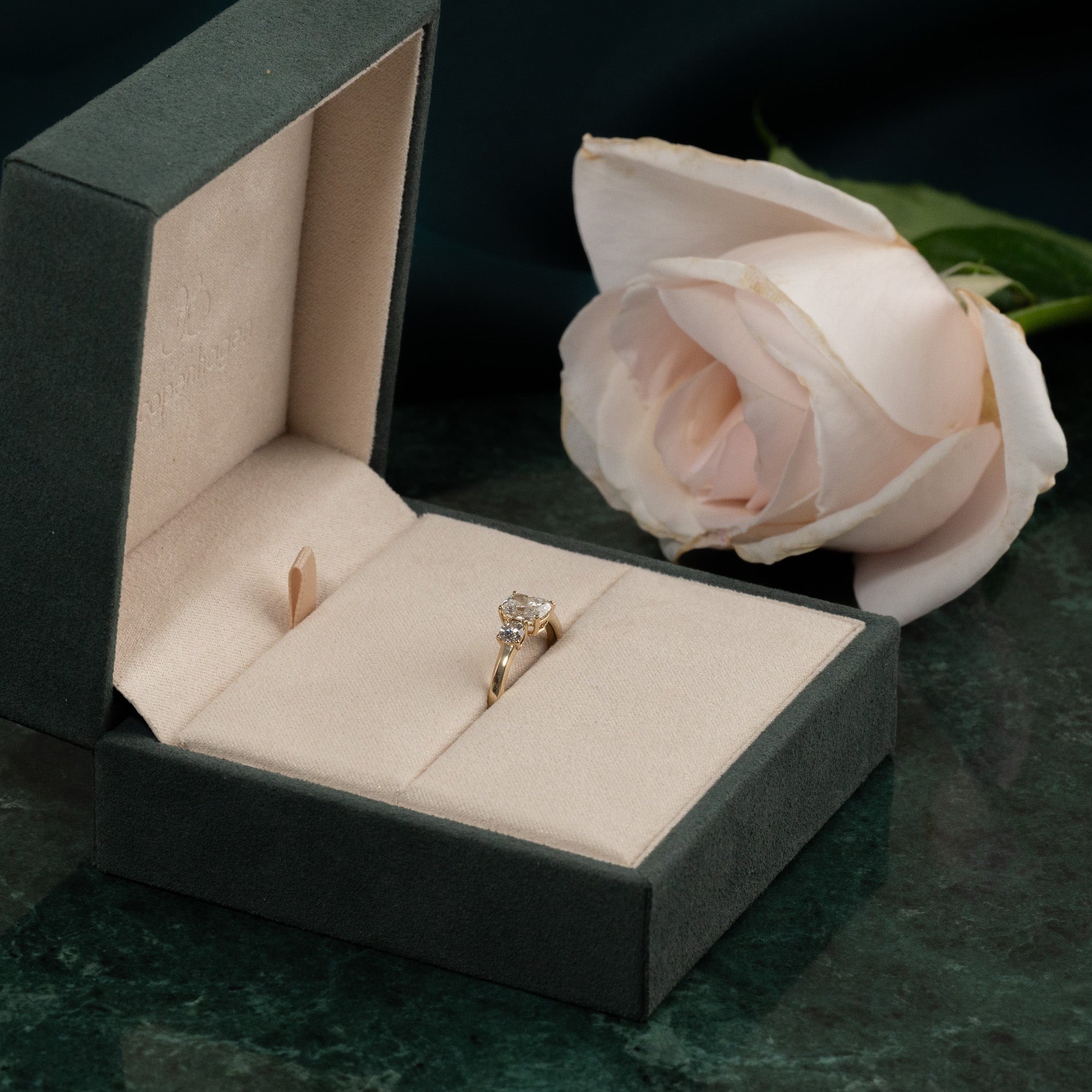 Smycket är vackert och säkert placerat i en smyckeskrin som är klädd i veganskt mocka.