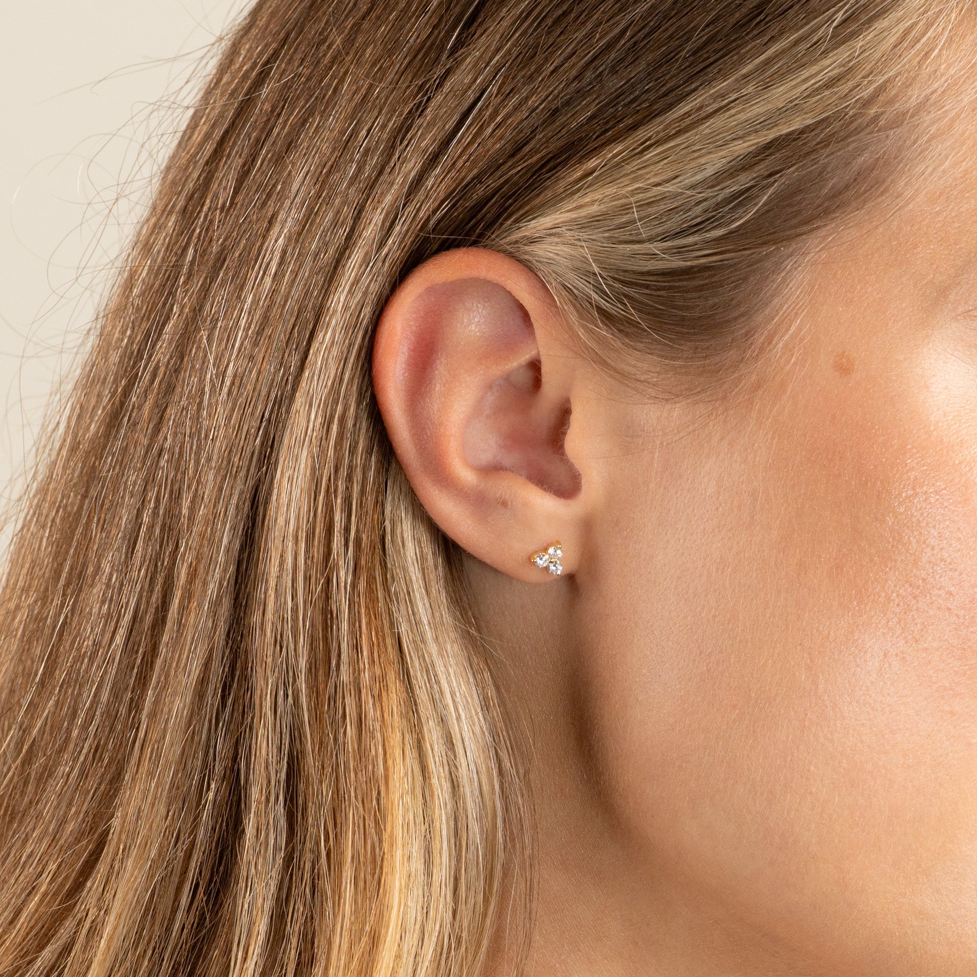 Våra Tria-örhängen är gjorda av 100 % återvunnet 18 karats guldpläterat sterlingsilver, besatt med zirkoner. På varje örhänge sitter tre runda zirkoner, som tillsammans bildar en fin triangel. Örhängena är otroligt vackra när de små zirkonerna glittrar i ljuset. Bär dem ensamm eller kombinera dem med andra örhängen om du har flera hål i öronen.