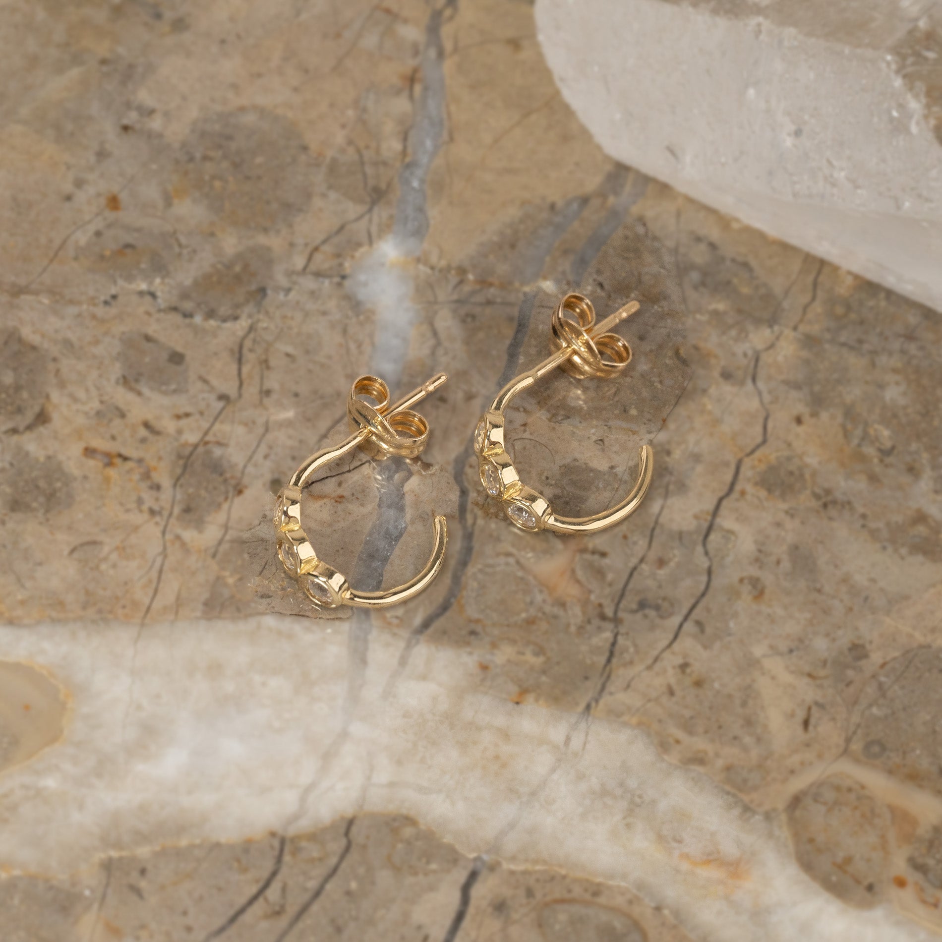 Vackra örhängen i 100% återvunnet massivt 9 karat guld. Örhängena består av tre vita topasstenar, som ger örhänget unika detaljer och ett feminint utseende.