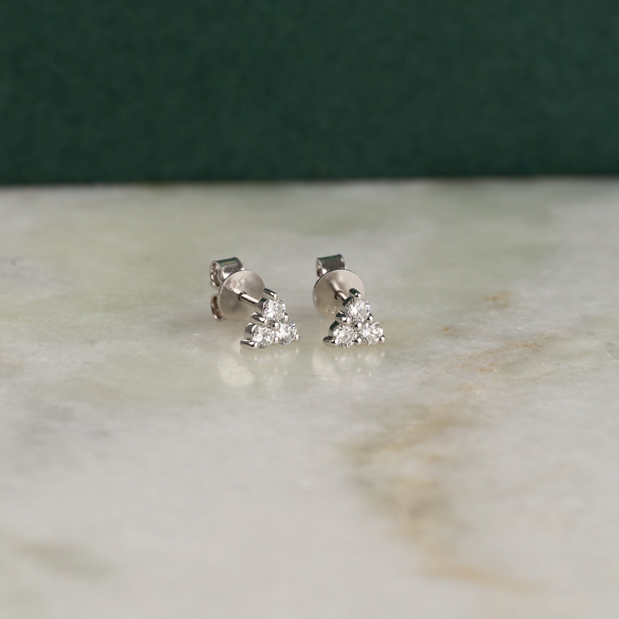 Ett par örhängen med tre briljantslipade labbodlade diamanter arrangerade i en triangel. Dessa örhängen är enkla och eleganta och perfekta för både vardagsbruk och speciella tillfällen. Örhängena mäter cirka 6 x 6 mm.