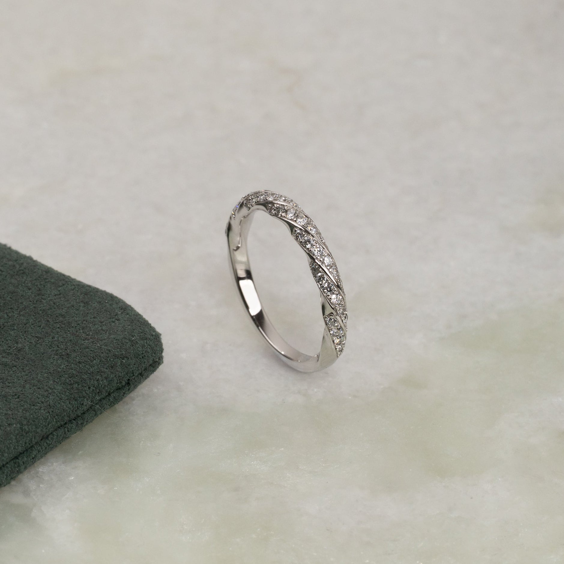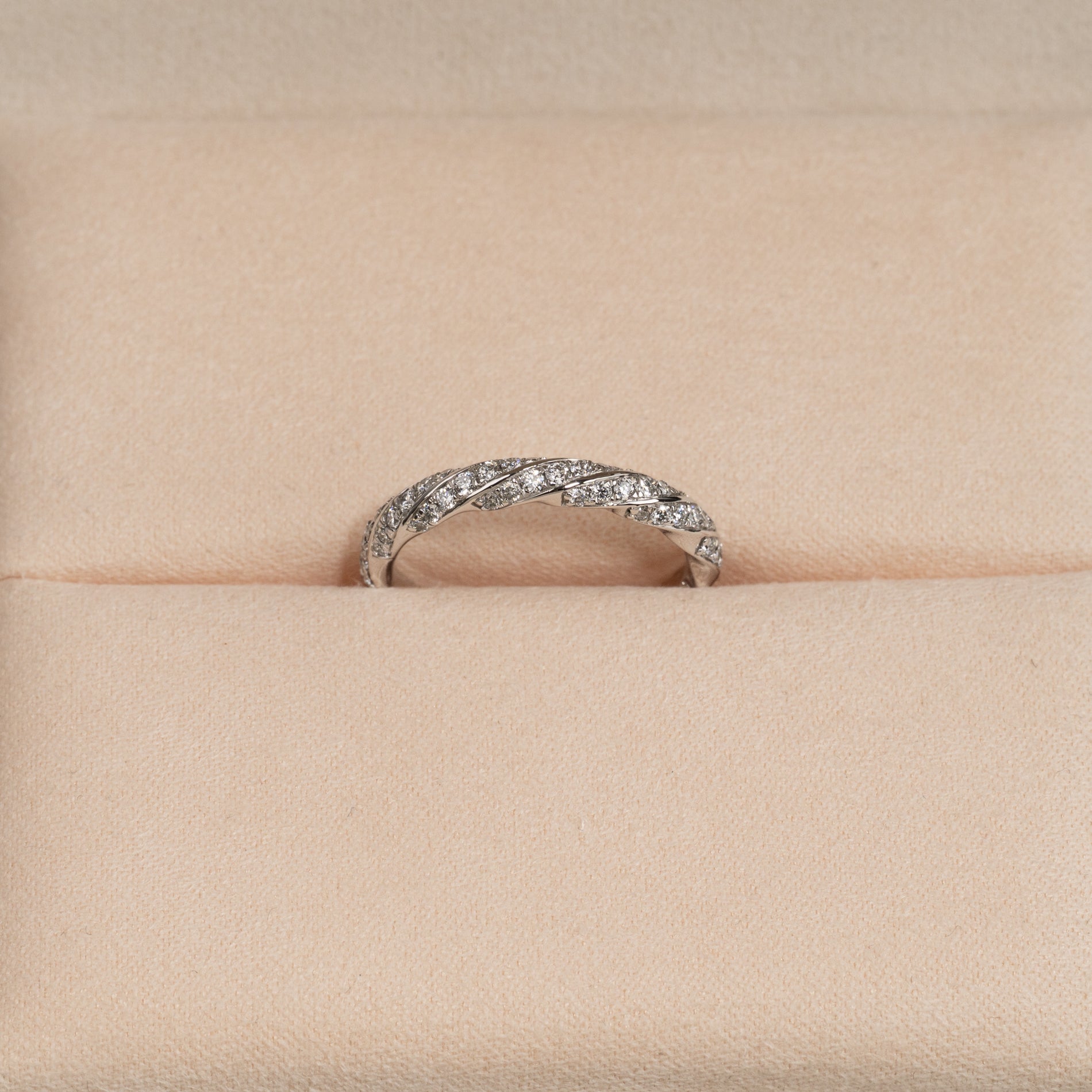 Alliansring i 14 kt. massivt vitguld med 0,4 ct. labbodlade diamanter. Ringen består av diamanter i gradvis storlek, som vackert slingrar sig runt ringskenan på ovansidan. Ringen sticker verkligen ut med sin unika och spännande design.