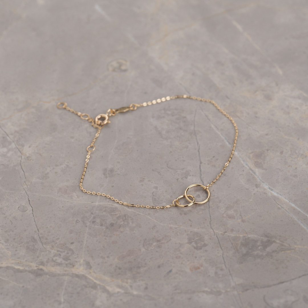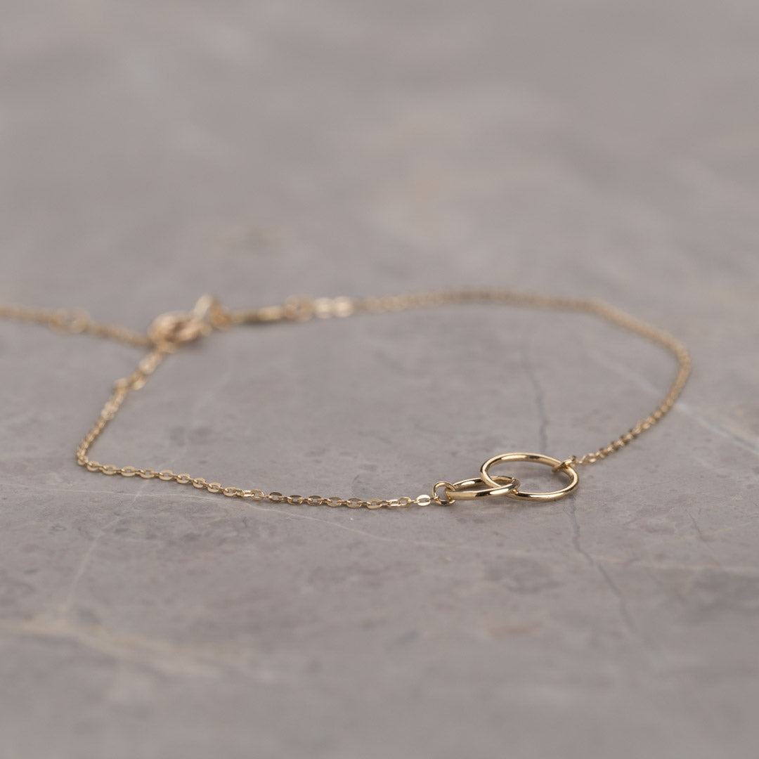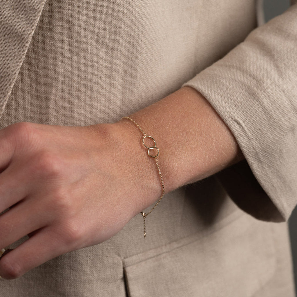Vårt Una -armband i 100% återvunnet 9 karats massivt guld. Armbandet är tillverkat med en klassisk kedja där det finns två cirklar som sitter ihop i mitten i en sammankopplad ring. Detta ger designen en feminin men enkel detalj.
