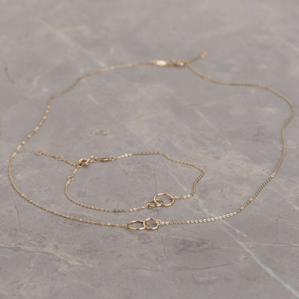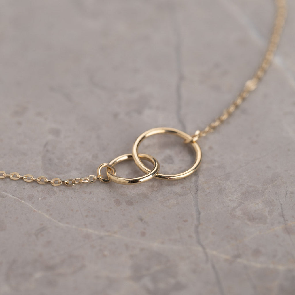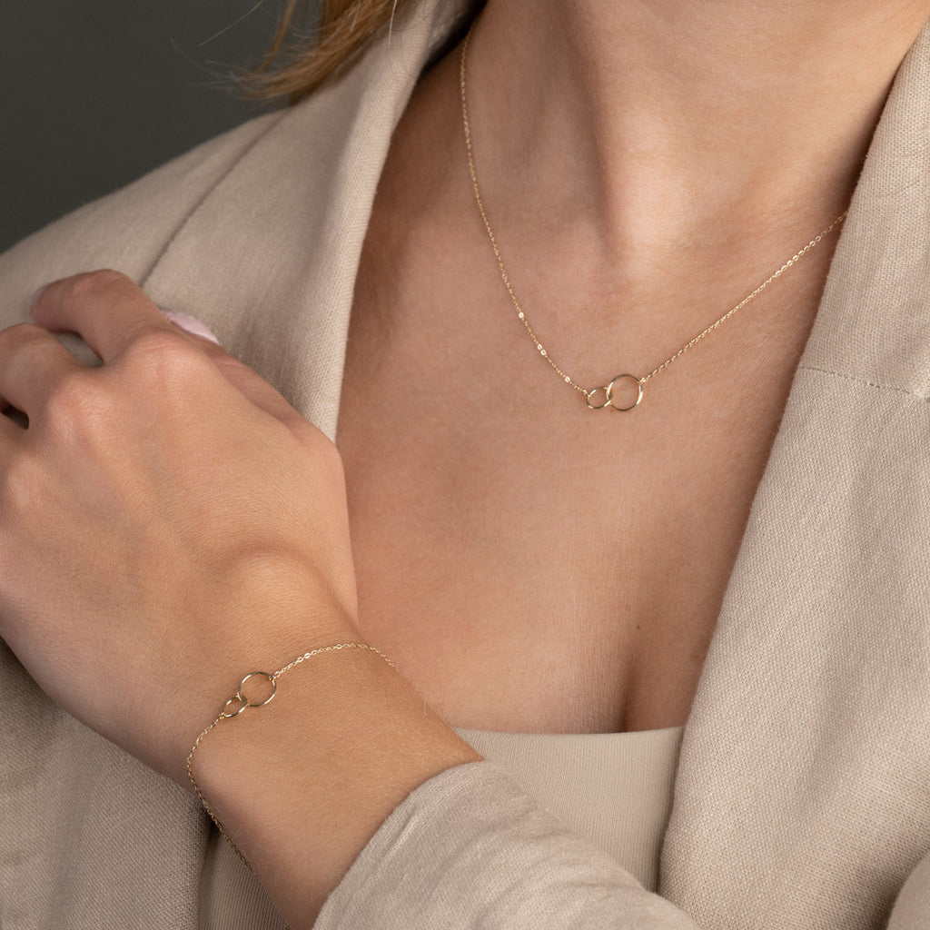 Vårt Una -armband i 100% återvunnet 9 karats massivt guld. Armbandet är tillverkat med en klassisk kedja där det finns två cirklar som sitter ihop i mitten i en sammankopplad ring. Detta ger designen en feminin men enkel detalj.