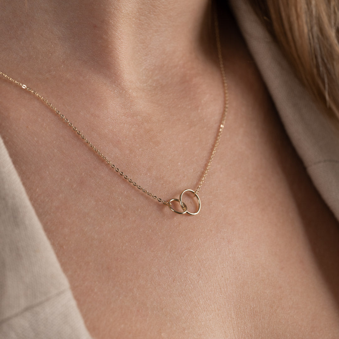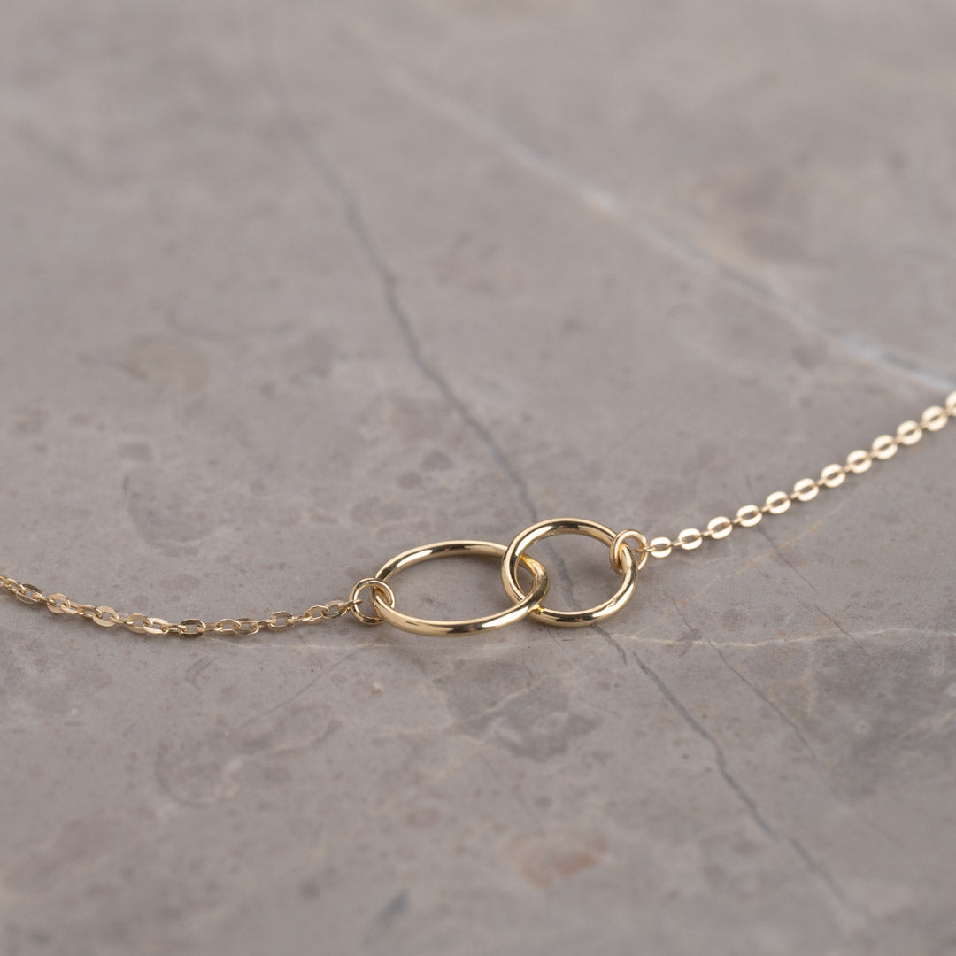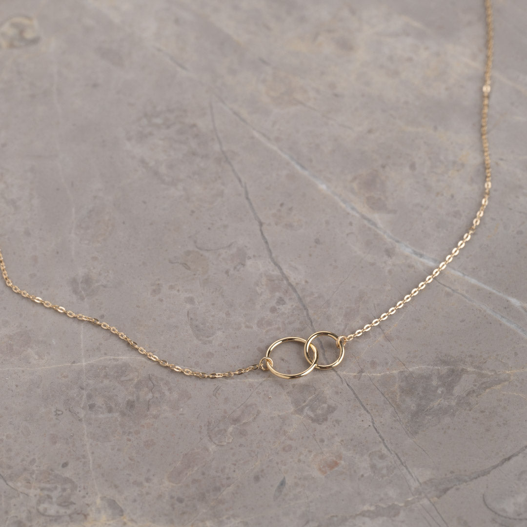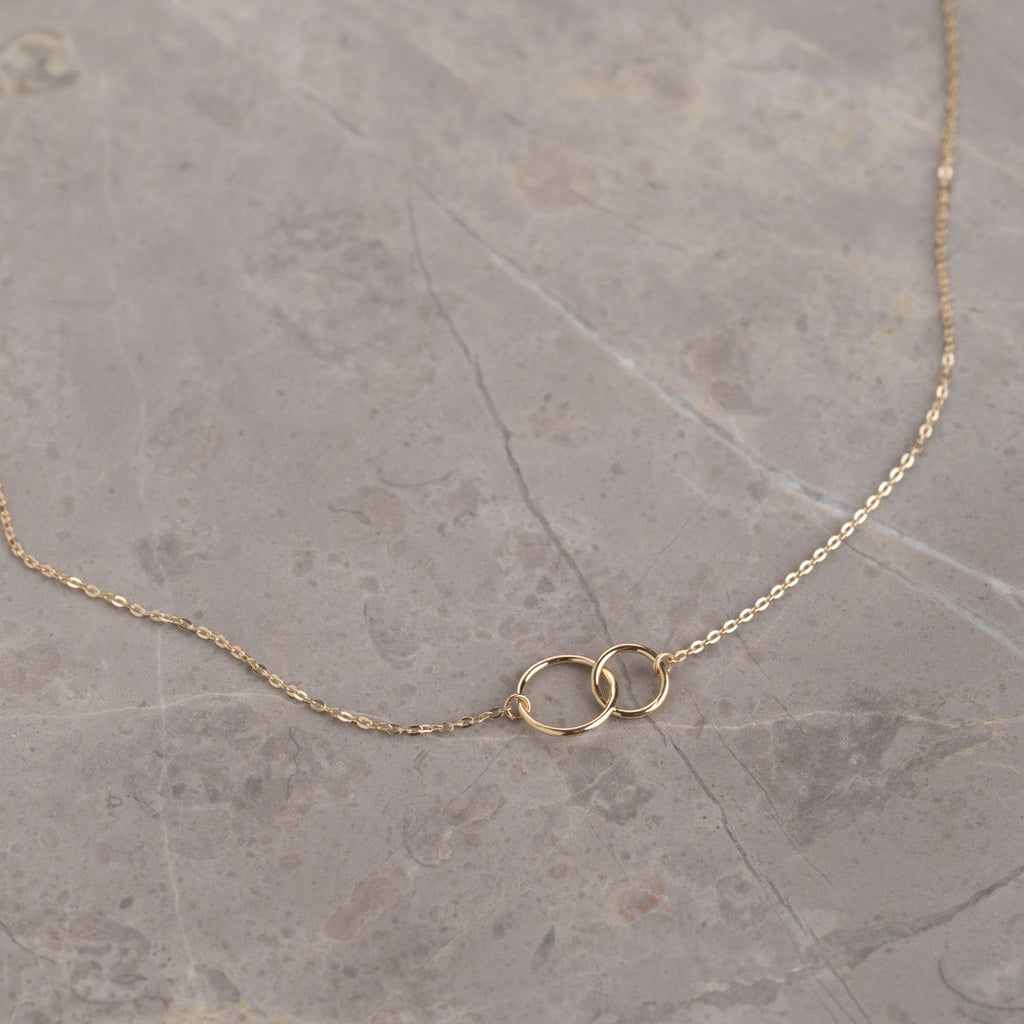 Vårt UNA -halsband är tillverkat av 100% återvunnet solid 9 karats guld. Halsbandet är utformat med en lätt ankarkedja och har två sammankopplade ringar som bildar en fin symbolisk detalj på halsbandet.