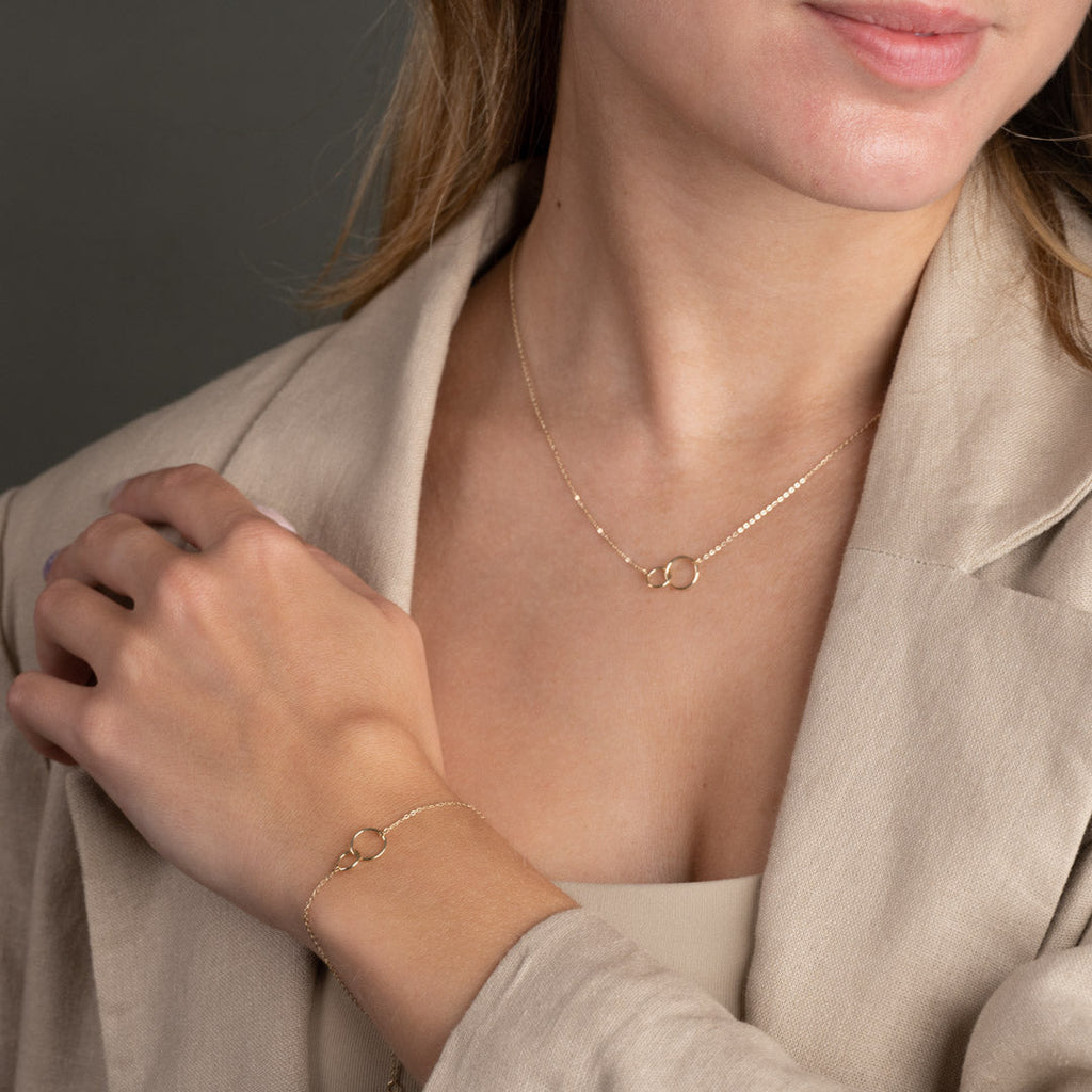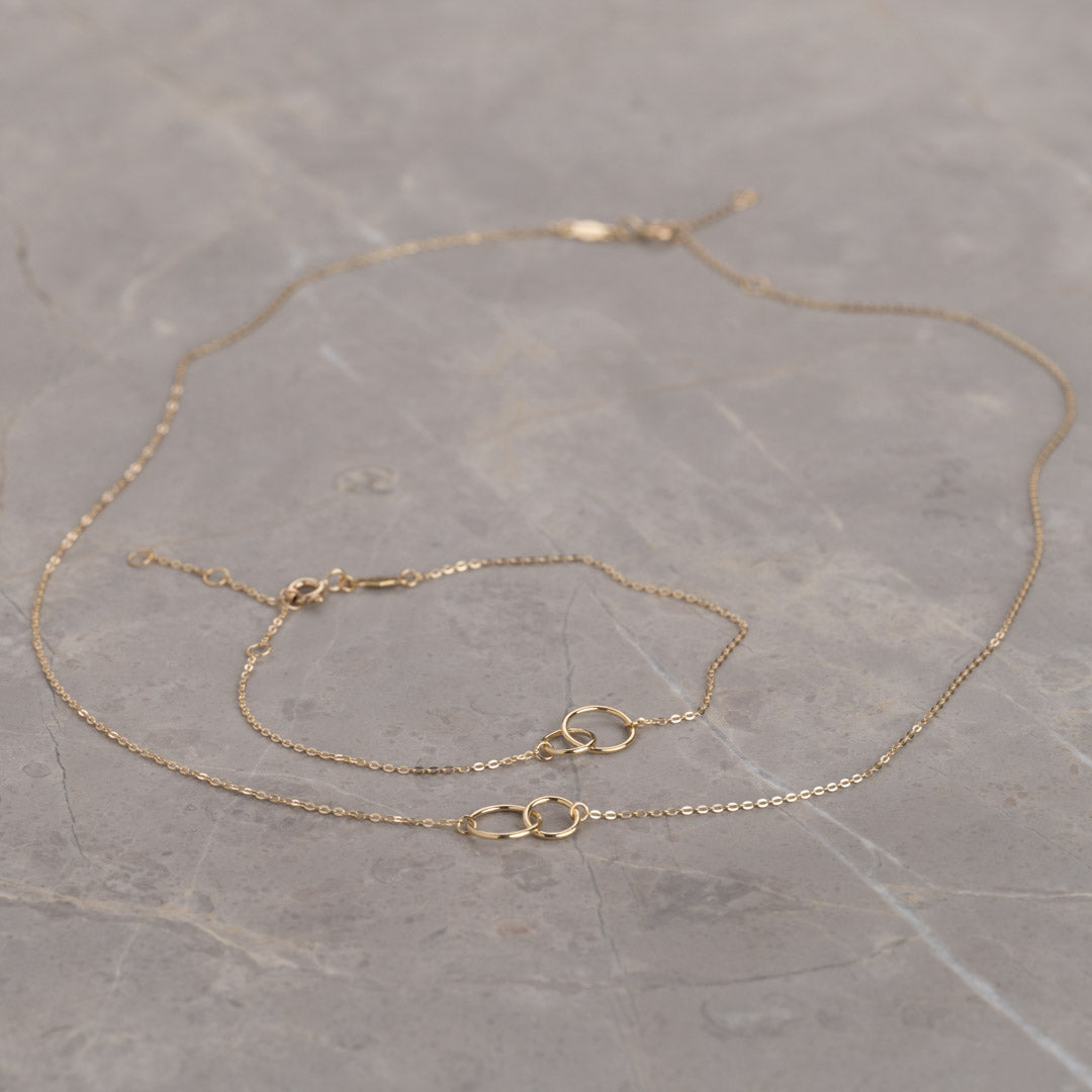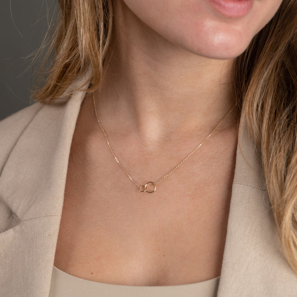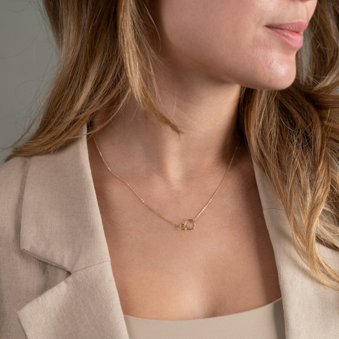 Vårt UNA -halsband är tillverkat av 100% återvunnet solid 9 karats guld. Halsbandet är utformat med en lätt ankarkedja och har två sammankopplade ringar som bildar en fin symbolisk detalj på halsbandet.