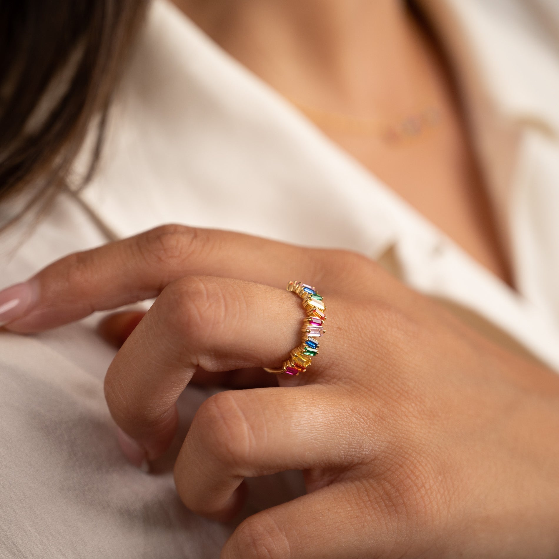 Ring i 100% återvunnet 18 karats guldpläterat 925 sterlingsilver med vackra regnbågsfärgade zirkoner. Ringen består av ett antal vackra regnbågsfärgade, fyrkantigt fasetterade zirkoner, i en ostrukturerad linje.