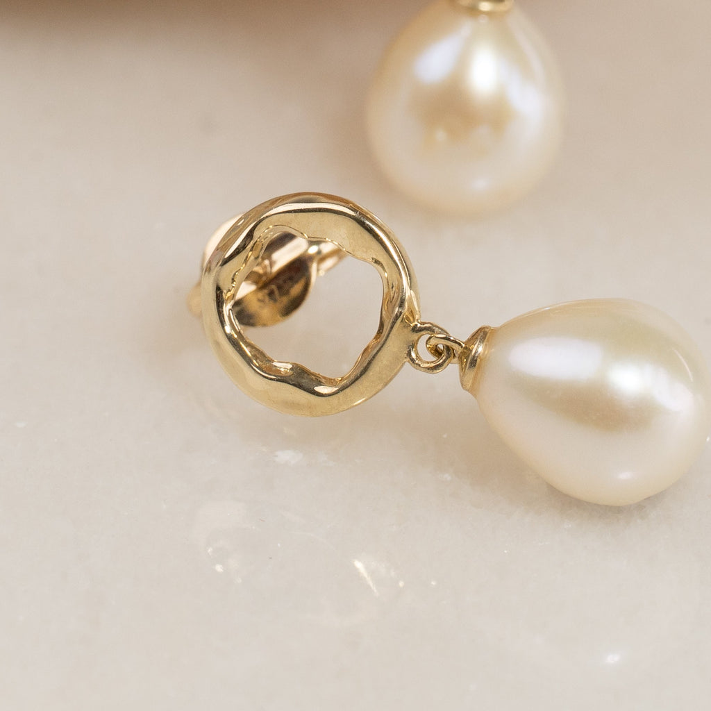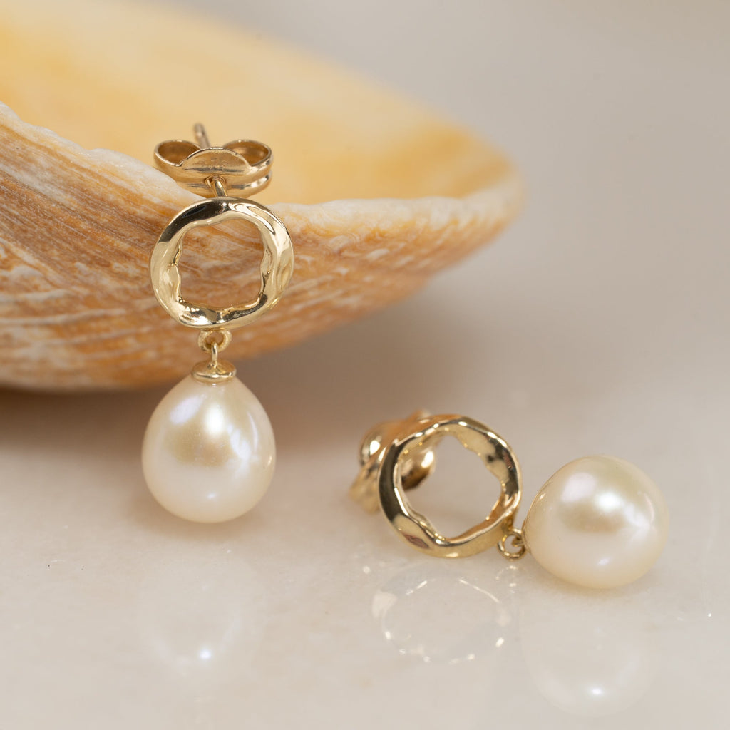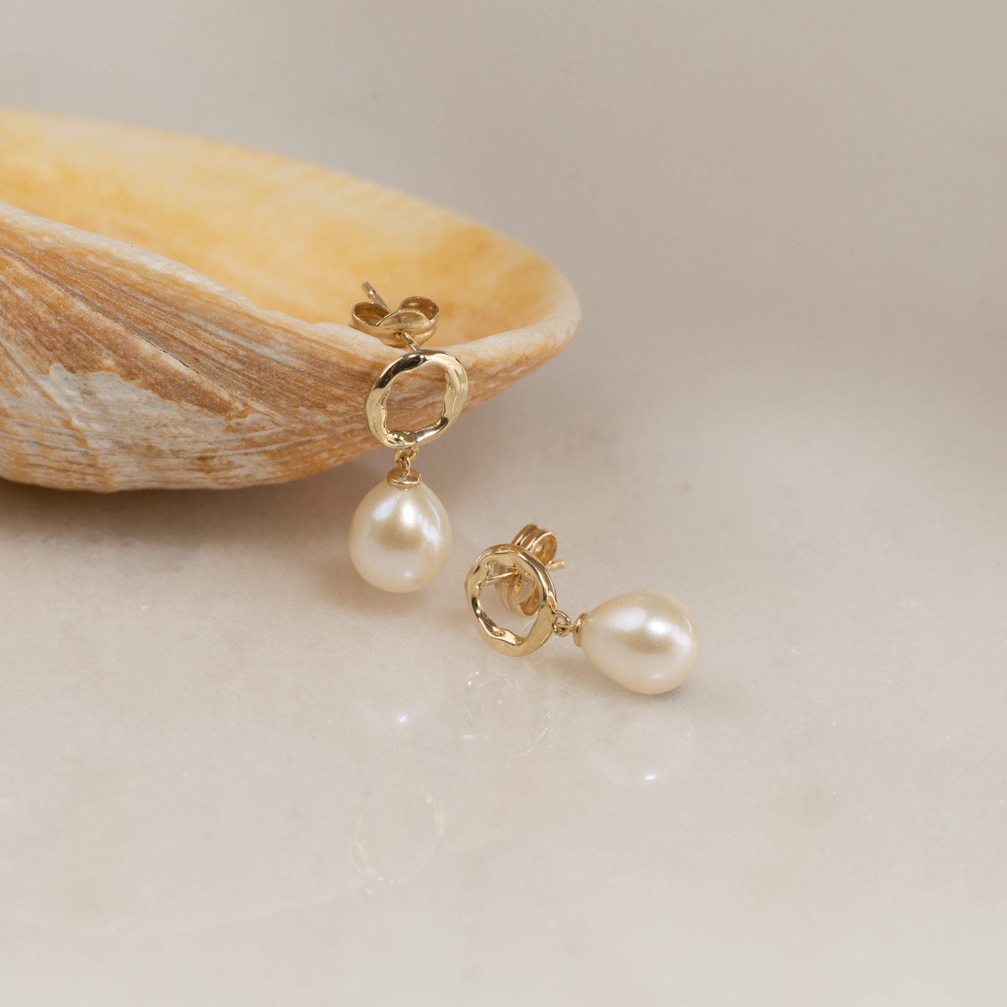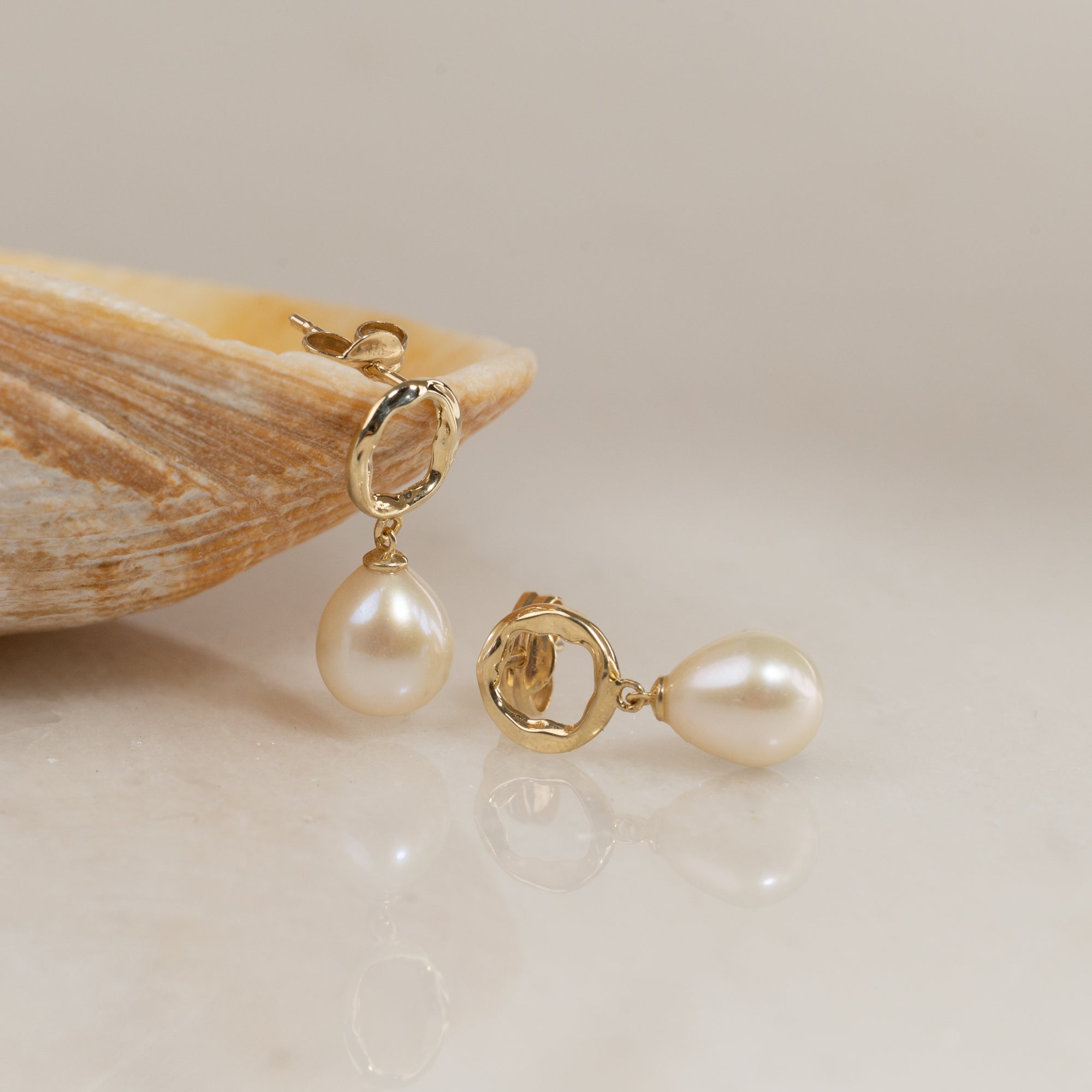 Örhängen i massivt 9 karat 100% återvunnet guld med vita sötvattenspärlor.